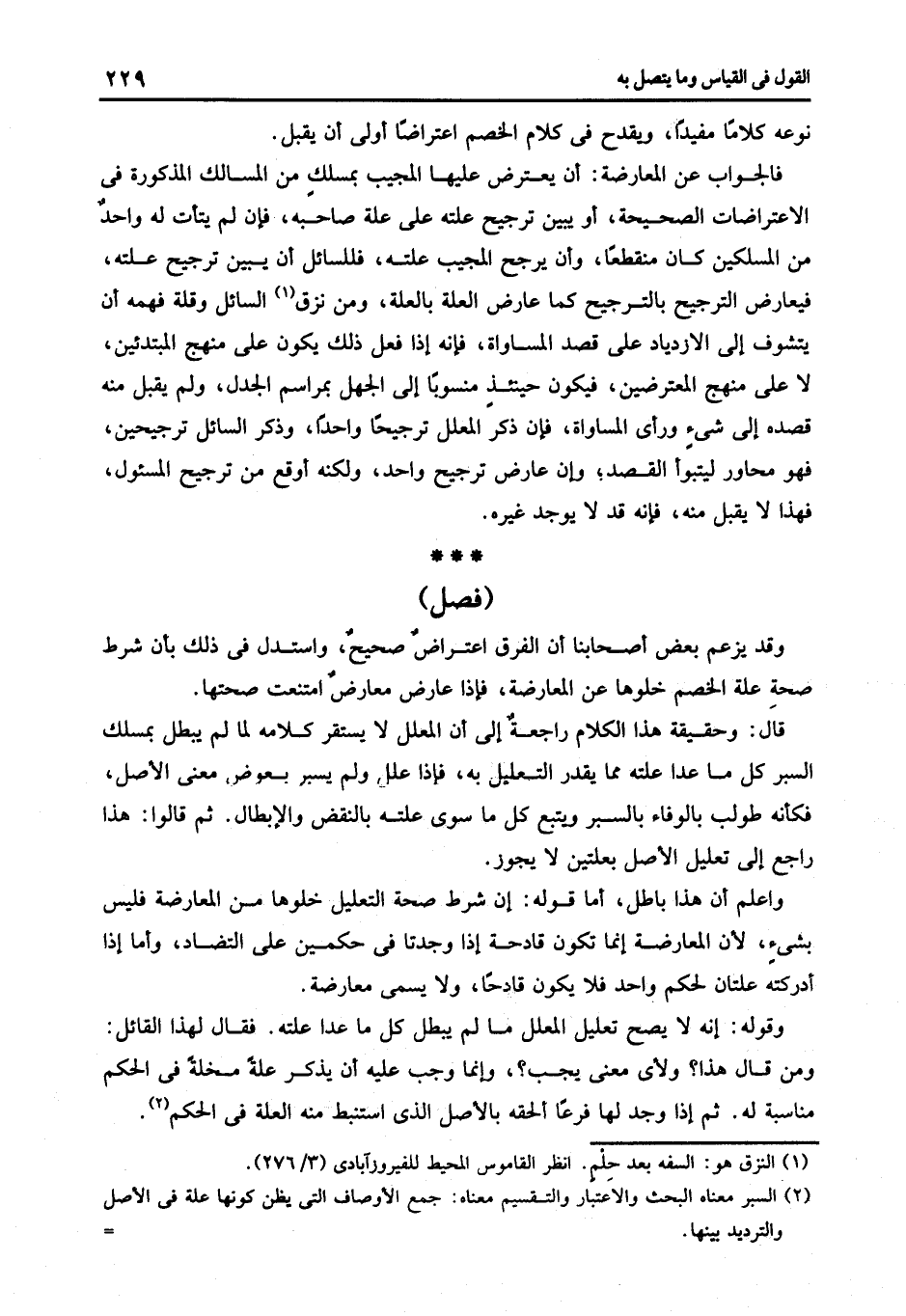 فالجواب عن المعارضة: أن يعترض عليها المجيب بمسلك من المسالك المذكورة في الاعتراضات الصحيحة أو يبين ترجيح علته على علة صاحبه فإن لم يتأت له واحد من المسلكين كان منقطعا وأن يرجح المجيب علته فللسائل أن يبين ترجيح علته فيعارض الترجيح بالترجيح كما عارض العلة بالعلة ومن نزق1 السائل وقلة فهمه أن يتشوف إلى الازدياد على قصد المساواة فإنه إذا فعل ذلك يكون على منهج المبتدئين لا على منهج المعترضين فيكون حينئذ منسوبا إلى الجهل بمراسم الجدل ولم يقبل منه قصده إلى شئ ورأى المساواة فإن ذكر المعلل ترجيحا واحدا وذكر السائل ترجيحين فهو محاور ليتبوأ القصد وإن عارض ترجيح واحد ولكنه أوقع من ترجيح المسئول فهذا لا يقبل منه فإنه قد لا يوجد غيره.