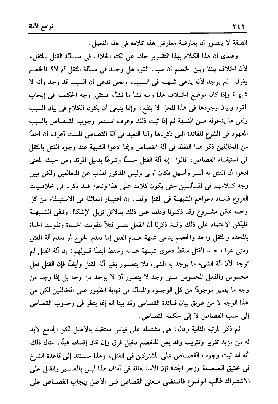 وعندي أن هذا الكلام بهذا التقرير حائد عن نكثه الخلاف في مسألة القتل بالمثقل لأن الخلاف بيننا وبين الخصم أن سبب القود هل وجد في مسألة المثقل أم لا؟ فالخصم يقول: لم يوجد لأنه يدعى شبهه في السبب ونحن ندعى أن السبب قد وجد وأنه لا شبهة وإذا كان موضع الخلاف هذا ومنه نشأ ما نشأ فتقرر وجه الحكمة في إيجاب القود وبيان وجودها في هذا المحل لا ينفع وإنما ينبغى أن يكون الكلام في بيان السبب ونفى ما يدعونه من الشبهة ثم إذا ثبت ذلك وعرف استمر وجوب القصاص بالسبب المعهود في الشرع للفائدة التي ذكرناها وأما التعبد في آلة القصاص فلست أعرف أن أحدا من المخالفين ذكر هذا اللفظ في آلة القصاص وإنما ادعوا الشبهة عند وجود القتل بالمثقل في استيفاء القصاص قالوا: إنه آلة القتل حسا وشرعا بدليل المرتد ومن حيث المعنى ادعوا أن القتل به أيسر وأسهل فكان أولى وليس المذكور للذب عن المخالفين ولكن يبين وجه كلامهم في المسألتين حتى يكون كلامنا على هذا ونحن قد ذكرنا في خلافيات الفروع فساد دعواهم الشبهة في القتل وقلنا: إن اعتبار المماثلة في الاستيفاء من كل وجه ممكن مشروع وقد ذكرنا ودللنا على ذلك بدلائل تزيل الإشكال وتنفى الشبهة فليكن الاعتماد على ذلك وقد ذكرنا أن الفعل يصير قتلا بتفويت الحياة وتفويت الحياة بالمحدد والمثقل واحد والخصم يدعى شبهة عدم القتل إما بعدم الحرج أو بعدم آلة القتل ومتى عرف حد القتل سقط دعوى شبهة عدمه وسقط أيضا قولهم إن آلة القتل لم توجد لأن آلة الشئ ما يوجد به الشئ فلا يتصور بغير آلة القتل وأيضا فإن القتل فعل محسوس والفعل المحسوس متى وجد لا يتصور أن لا يوجد من وجه بل إذا وجد من وجه ما يصير موجودا من كل الوجوه والمسألة في نهاية الظهور على المخالفين لكن من هذا الوجه لا من طريق بيان فائدة القصاص وقد بينا أنه إنما ينطر في وجوب القصاص إلى سبب القصاص لا إلى حكمة القصاص.