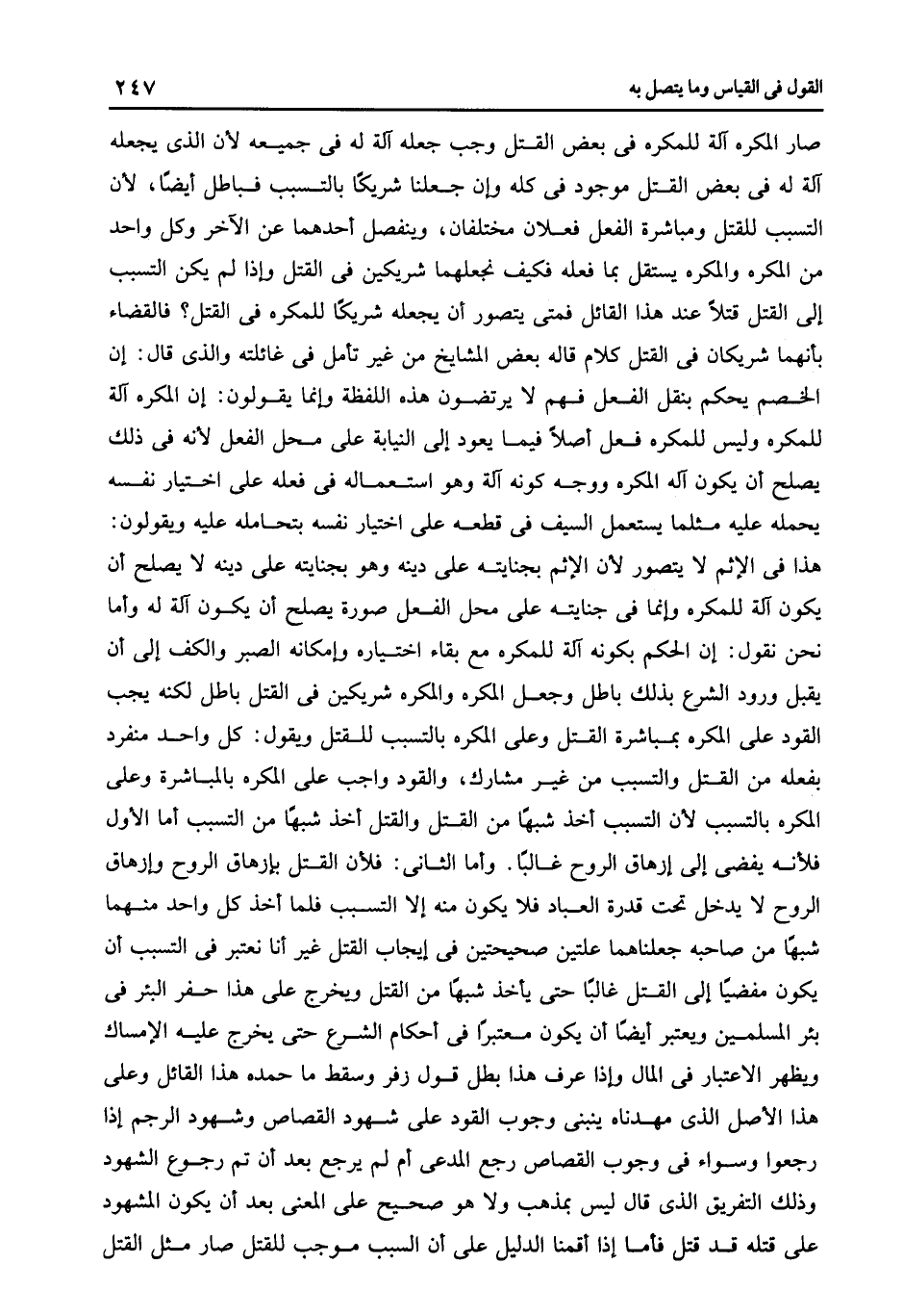 صار المكره آلة للمكره في بعض القتل وجب جعله آلة له في جميعه لأن الذى يجعله آلة له في بعض القتل موجود في كله وإن جعلنا شريكا بالتسبب فباطل أيضا لأن التسبب للقتل ومباشرة الفعل فعلان مختلفان وينفصل أحدهما عن الآخر وكل واحد من المكره والمكره يستقل بما فعله فكيف نجعلهما شريكين في القتل وإذا لم يكن التسبب إلى القتل قتلا عند هذا القائل فمتى يتصور أن يجعله شريكا للمكره في القتل فالقضاء بأنهما شريكان في القتل كلام قاله بعض المشايخ من غير تأمل في عائلته والذى قال: إن الخصم يحكم بنقل الفعل فهم لا يرتضون هذه اللفظة وإنما يقولون إن المكره آلة للمكره وليس للمكره فعل أصلا فيما يعود إلى النيابة على محل الفعل لأنه في ذلك يصلح أن يكون أله المكره ووجه كونه آلة وهو استعماله في فعله على اختيار نفسه يحمله عليه مثلما يستعمل السيف في قطعه على اختيار نفسه بتحامله عليه ويقولون هذا في الإثم لا يتصور لأن الإثم بجنايته على دينه وهو بجنايته على دينه لا يصلح أن يكون آلة للمكره وإنما في جنايته على محل الفعل صورة يصلح أن يكون آلة له وأما نحن نقول إن الحكم بكونه آلة للمكره مع بقاء اختياره وإمكانه الصبر والكف إلى أن يقبل ورود الشرع بذلك باطل وجعل المكره والمكره شريكين في القتل باطل لكنه يجب القود على المكره بمباشرة القتل وعلى المكره بالتسبب للقتل ويقول: كل واحد منفرد بفعله من القتل والتسبب من غير مشارك والقود واجب على المكره بالمباشرة وعلى المكره بالتسبب لأن التسبب أخذ شبها من القتل والقتل أخذ شبها من التسبب أما الأول فلأنه يفضى إلى إزهاق الروح غالبا وأما الثاني فلأن القتل بإزهاق الروح غالبا. وأما الثاني: فلأن القتل بإزهاق الروح وأزهاق الروح لا يدخل تحت قدرة العباد فلا يكون منه إلا التسبب فلما أخذ كل واحد منهما شبها من صاحبه جعلناهما علتين صحيحتين في إيجاب القتل غير أنا نعتبر في التسبب أن يكون مفضيا إلى القتل غالبا حتى يأخذ شبها من القتل ويخرج على هذا حفر البئر في بئر المسلمين ويعتبر أيضا أن يكون معتبرا في أحكام الشرع حتى يخرج عليه الإمساك ويظهر الاعتبار في المال وإذا عرف هذا بطل قول زفر وسقط ما حمده هذا القائل وعلى هذا الأصل الذى مهدناه ينبنى وجوب القود على شهود القصاص وشهود الرجم إذارجعوا وسواء في وجوب القصاص رجع المدعي أم لم يرجع بعد أن تم رجوع الشهود وذلك التفريق الذى قال: ليس بمذهب ولا هو صحيح على المعنى بعد أن يكون المشهود على قتله قد قتل فأما إذا أقمنا الدليل على أن السبب موجب للقتل صار مثل القتل
