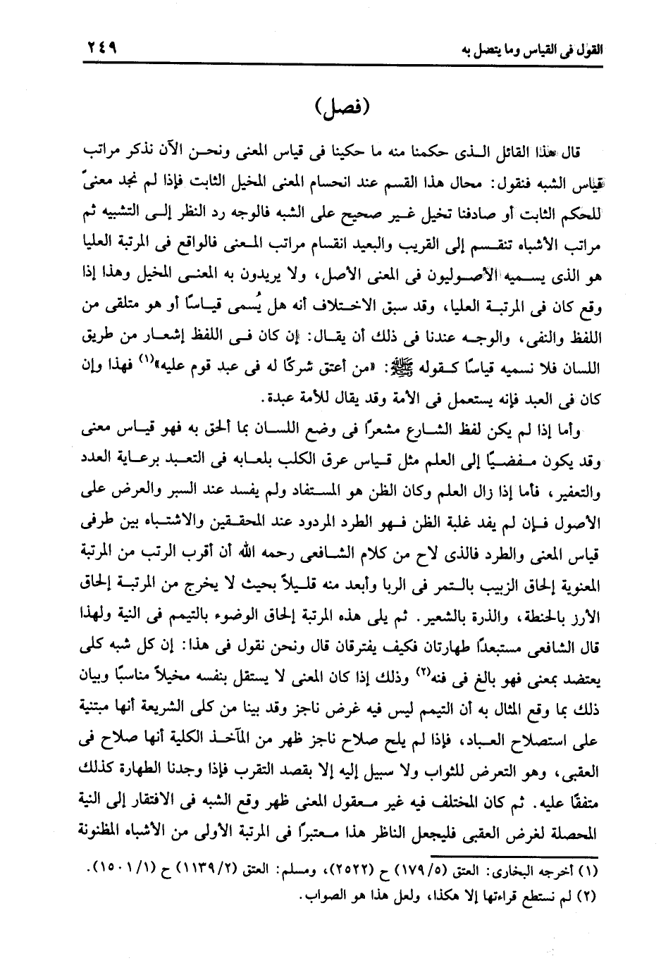 قال هذا القائل الذى حكمنا منه ما حكينا في قياس المعنى ونحن الآن نذكر مراتب قياس الشبه فنقول: محال هذا القسم عند انحسام المعنى المخيل الثابت فإذا لم نجد معنى للحكم الثابت أو صادفنا تخيل غير صحيح على الشبه فالوجه رد النظر إلى التشبيه ثم مراتب الأشباه تنقسم إلى القريب والبعيد انقسام مراتب المعنى فالواقع في المرتبة العليا هو الذى يسميه الأصوليون في المعنى الأصل ولا يريدون به المعنى المخيل وهذا إذا وقع كان في المرتبة العليا وقد سبق الاختلاف أنه هل يسمى قياسا أو هو متلقى من اللفظ والنفى والوجه عندنا في ذلك أن يقال: إن كان في اللفظ إشعار من طريق اللسان فلا نسميه قياسا كقوله صلى الله عليه وسلم: "من أعتق شركا له في عبد قوم عليه" 1 فهذا وإن كان في العبد فإنه يستعمل في الأمة وقد يقال للأمة عبدة