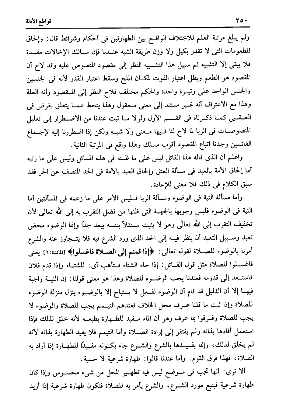 ولم يبلغ مرتبة العلم للاختلاف الواقع بين الطهارتين في أحكام وشرائط قال: وإلحاق المطعومات التي لا تقدر بكيل ولا وزن طريقة الشبه عندنا فإن مسالك الإخالات مفسدة فلا يبقى إلا التشبيه ثم سبيل هذا التشبيه النظر إلى مقصود المنصوص عليه وقد لاح أن المقصود هو الطعم وبطل اعتبار الفوت لمكان الملح وسقط اعتبار القدر لأنه في الجنسين والجنس الواحد على وتيره واحدة والحكم مختلف فلاح النظر إلى المقصود وأنه العلة وهذا مع الاعتراف أنه غير مستند إلى معنى معقول وهذا ينحط عما يتعلق بغرض في العقبى كما ذكرناه في القسم الأول ولولا ما ثبت عندنا من الاضطرار إلى تعليل المنصوصات في الربا لما لاح لنا فيها معنى ولا شبه ولكن إذا اضطررنا إليه لإجماع القائسين وجدنا اتباع المقصود أقرب مسلك وهذا واقع في المرتبة الثانية.