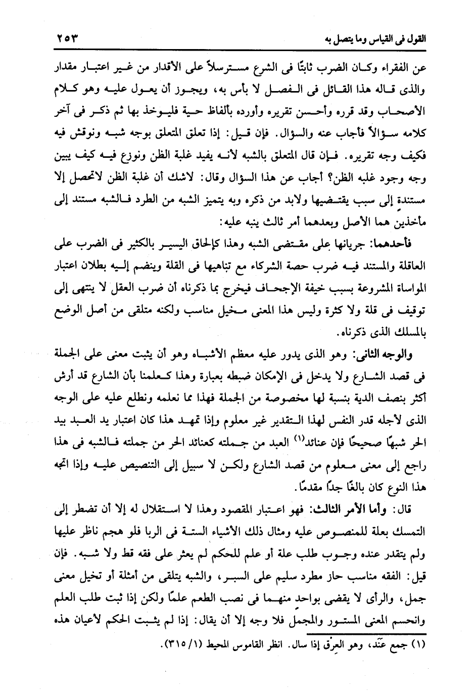والوجه الثانى: وهو الذى يدور عليه معظم الأشباه وهو أن يثبت معنى على الجملة في قصد الشارع ولا يدخل في الإمكان ضبطه بعبارة وهذا كعلمنا بأن الشارع قد أرش أكثر بنصف الدية بنسبة لها مخصوصة من الجملة فهذا مما نعلمه ونطلع عليه على الوجه الذى لأجله قدر النفس لهذا التقدير غير معلوم وإذا تمهد هذا كان اعتبار يعد العبد يد الحر شبها صحيحا فإن عنائد1 العبد من جملته كعنائد الحر من جملته فالشبه في هذا راجع إلى معنى معلوم من قصد الشارع ولكن لا سبيل إلى التنصيص عليه وإذا اتجه هذا النوع كان بالغا جدا مقدما.