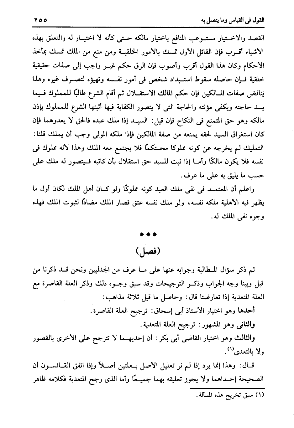 ثم ذكر سؤال المطالبة وجوابه عنها على ما عرف من الجدليين ونحن قد ذكرنا من قبل وبينا وجه الجواب وذكر الترجيحات وقد سبق وجوه ذلك وذكر العلة القاصرة مع العلة المتعدية إذا تعارضتا قال: وحاصل ما قيل ثلاثة مذاهب: