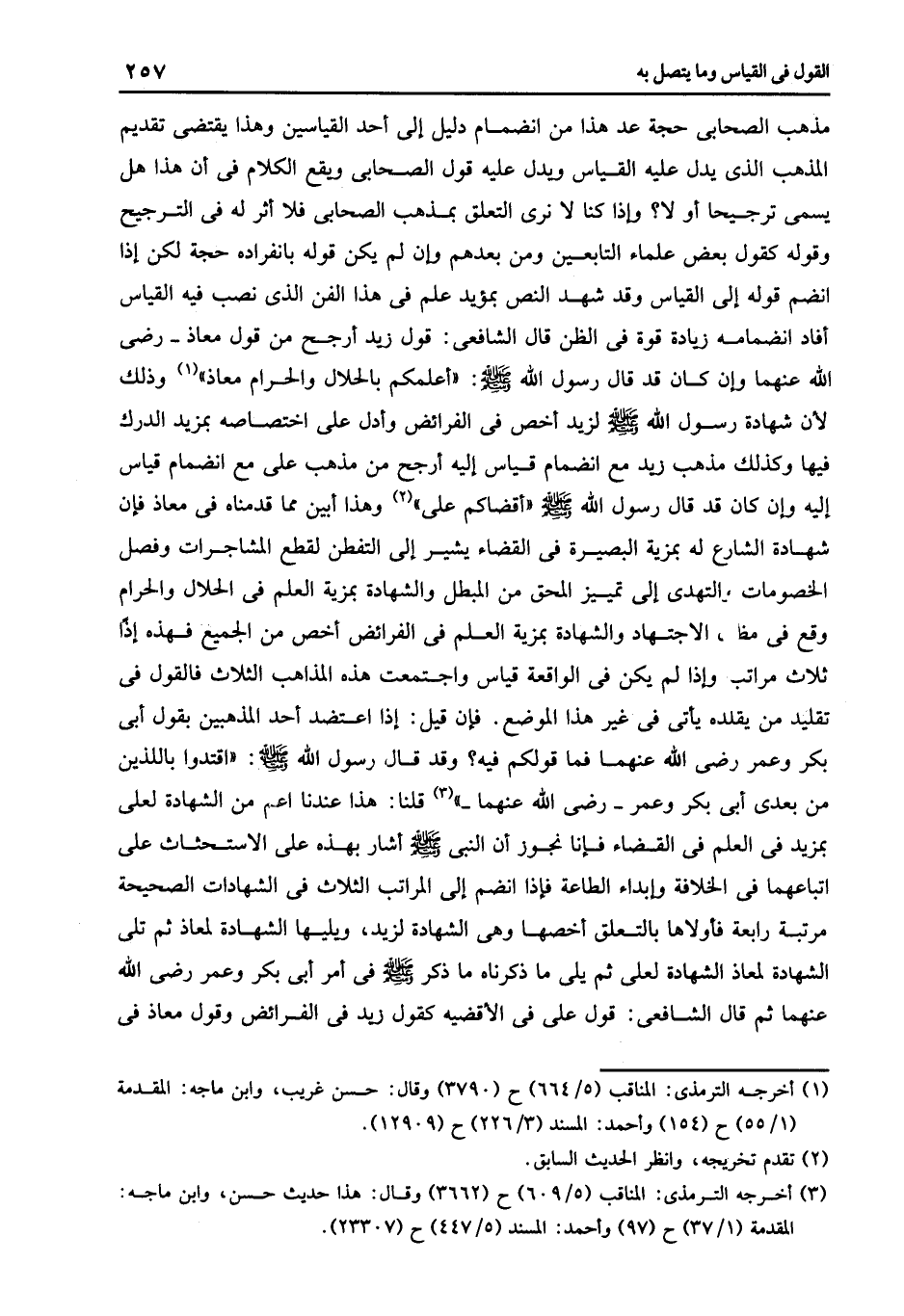 مذهب الصحابى حجة عد هذا من انضمام دليل إلى أحد القياسين وهذا يقتضى تقديم المذهب الذى يدل عليه القياس ويدل عليه قول الصحابى ويقع الكلام في أن هذا هل يسمى ترجيحا أو لا؟ وإذا كنا لا نرى التعلق بمذهب الصحابى فلا أثر له في الترجيح وقوله كقول بعض علماء التابعين ومن بعدهم وإن لم يكن قوله بانفراده حجة لكن إذا انضم قوله إلى القياس وقد شهد النص بمؤيد علم في هذا الفن الذى نصب فيه القياس أفاد انضمامه زيادة قوة في الظن قال الشافعى: قول زيد أرجح من قول معاد رضى الله عنهما وإن كان قد قال رسول الله صلى الله عليه وسلم: "أعلمكم بالحلال والحرام معاذ" 1 وذلك لأن شهادة رسول الله صلى الله عليه وسلم لزيد أخص في الفرائض وأدل على اختصاصه بمزيد الدرك فيها وكذلك مذهب زيد مع انضمام قياس إليه أرجح من مذهب على مع انضمام قياس إليه وإن كان قد قال رسول الله صلى الله عليه وسلم: "أقضاكم علي" 2 وهذا أبين مما قدمناه في معاذ فإن شهادة الشارع له بمزية البصيرة في القضاء يشير إلى التفطن لقطع المشاجرات وفصل الخصومات والتهدى إلى تمييز المحق من المبطل والشهادة بمزية العلم في الحلال والحرام وقع في مض الاجتهاد والشهادة بمزية العلم في الفرائض أخص من الجميع فهذه إذا ثلاث مراتب وإذا لم يكن في الواقعة قياس واجتمعت هذه المذاهب الثلاث فالقول في تقليد من يقلده يأتي في غير هذا الموضع. فإن قيل: إذا اعتضد أحد المذهبين بقول أبى بكر وعمر رضى الله عنهما فما قولكم فيه؟ وقد قال رسول الله صلى الله عليه وسلم: "اقتدوا باللذين من بعدى أبى بكر وعمر -رضي الله عنهما-"3 قلنا هذا عندنا اعم من الشهادة لعلى بمزيد في العلم في القضاء فإنا نجوز أن النبى صلى الله عليه وسلم أشار بهذه على الاستحثاث على اتباعهما في الخلافة وإبداء الطاعة فإذا انضم إلى المراتب الثلاث في الشهادات الصحيحة مرتبة رابعة فأولاها بالتعلق أخصها وهى الشهادة لزيد ويليها الشهادة لمعاذ ثم تلى الشهادة لمعاذ الشهادة لعلى ثم يلى ما ذكرناه ما ذكر صلى الله عليه وسلم في أمر أبى بكر وعمر رضى الله عنهما ثم قال الشافعى: قول علي في الأقضية كقول زيد في الفرائض وقول معاذ فى