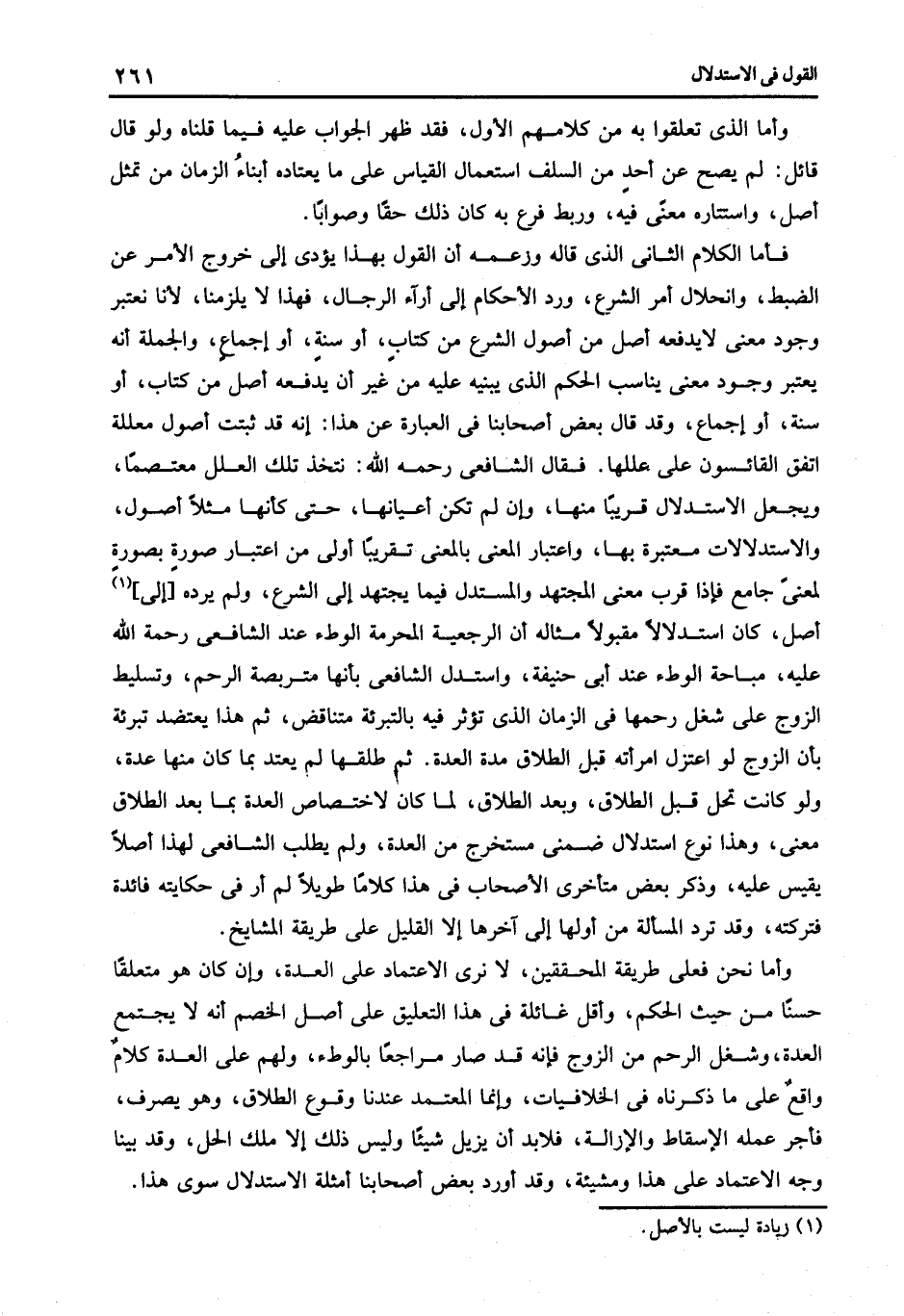 فأما الكلام الثانى الذى قاله وزعمه أن القول بهذا يؤدى إلى خروج الأمر عن الضبط وانحلال أمر الشرع ورد الأحكام إلى أرآء الرجال فهذا لا يلزمنا لأنا نعتبر وجود معنى لا يدفعه أصل من أصول الشرع من كتاب أو سنة أو إجماع والجملة أنه يعتبر وجود معنى يناسب الحكم الذى يبنيه عليه من غير أن يدفعه أصل من كتاب أو سنة أو إجماع وقد قال بعض أصحابنا في العبارة: عن هذا إنه قد ثبتت أصول معللة اتفق القائسون على عللها فقال الشافعى رحمه الله: نتخذ تلك العلل معتصما ويجعل الاستدلال قريبا منها وإن لم تكن أعيانها حتى كأنها مثلا أصول والاستدلالات معتبرة بها واعتبار المعنى بالمعنى تقريبا أولى من اعتبار صورة بصورة لمعنى جامع فإذا قرب معنى المجتهد والمستدل فيما يجتهد إلى الشرع ولم يرده [إلى] 1 أصل كان استدلالا مقبولا مثاله أن الرجعية المحرمة الوطء عند الشافعي رحمه الله عليه مباحة الوطء عند أبى حنيفة واستدل الشافعى بأنها متربصة الرحم وتسليط الزوج على شغل رحمها في الزمان الذى تؤثر فيه بالتبرئة متناقض ثم هذا يعتضد تبرئة بأن الزوج لو اعتزل امرأته قبل الطلاق مدة العدة. ثم طلقها لم يعتد بما كان منها عدة ولو كانت تحل قبل الطلاق وبعد الطلاق لما كان لاختصاص العدة بما يعد الطلاق معنى وهذا نوع استدلال ضمنى مستخرج من العدة ولم يطلب الشافعى لهذا أصلا يقيس عليه وذكر بعض متأخرى الأصحاب في هذا كلاما طويلا لم أر في حكايته فائدة فتركته وقد ترد المسألة من أولها إلى آخرها إلا القليل على طريقة المشايخ.