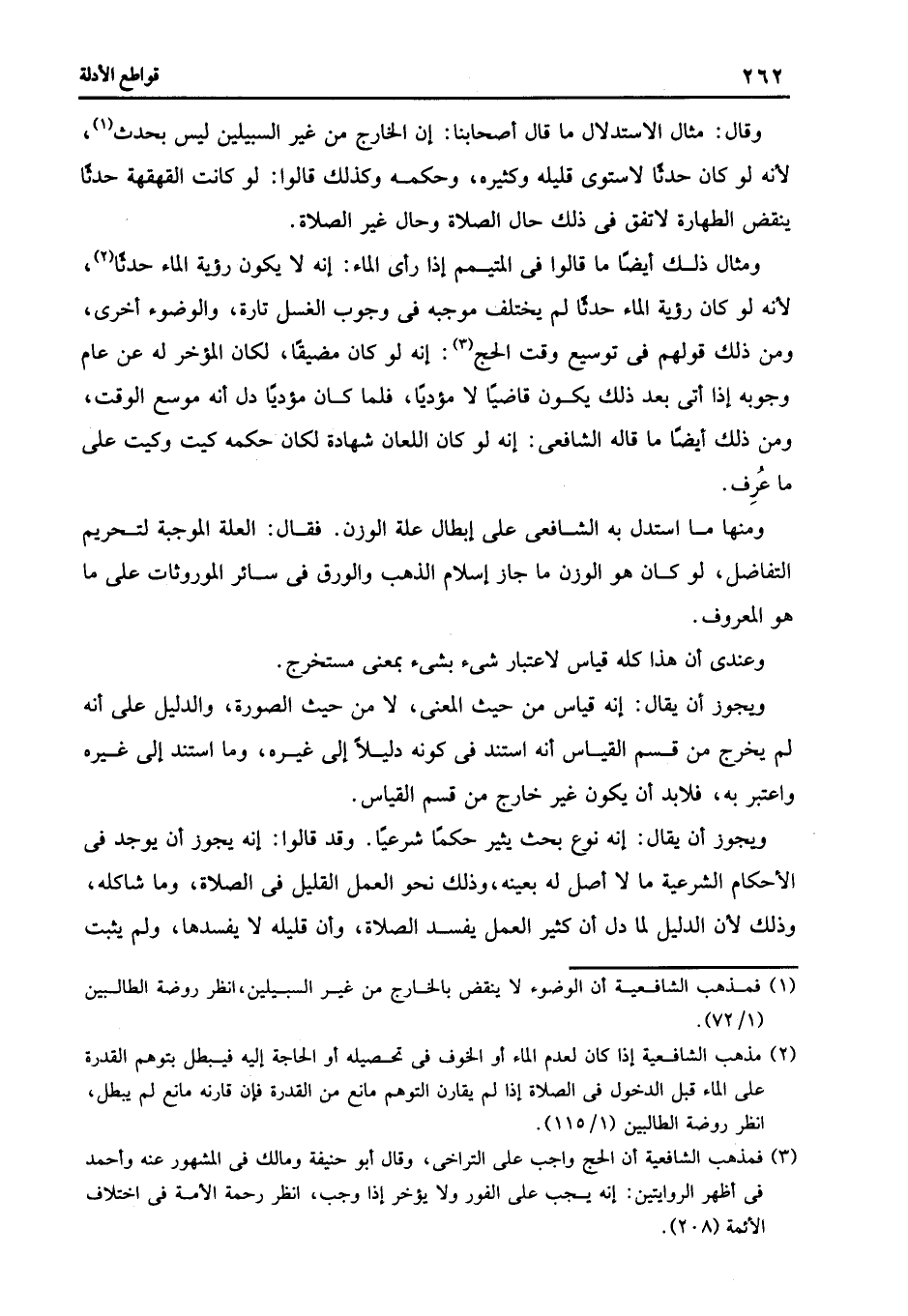 وقال: مثال الاستدلال ما قال أصحابنا: إن الخارج من غير السبيلين ليس بحدث1 لأنه لو كان حدثا لاستوى قليله وكثيره وحكمه وكذلك قالوا: لو كانت القهقهة حدثا ينقض الطهارة لاتفق في ذلك حال الصلاة وحال غير الصلاة.