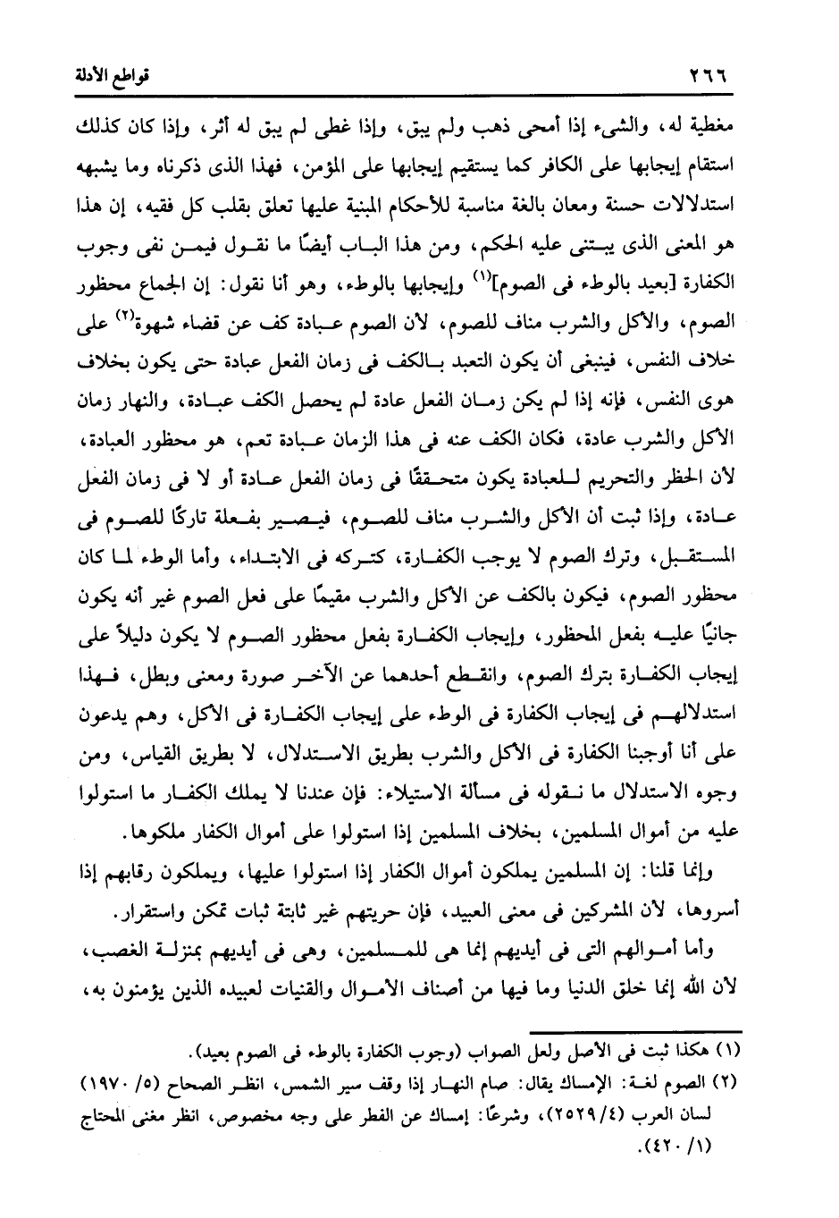 مغطية له والشئ إذا أمحى ذهب ولم يبق وإذا غطى لم يبق له أثر وإذا كان كذلك استقام إيجابها على الكافر كما يستقيم إيجابها على المؤمن فهذا الذى ذكرناه وما يشبهه استدلالات حسنة ومعان بالغة مناسبة للأحكام المبنية عليها تعلق بقلب كل فقيه إن هذا هو المعنى الذى يبتنى عليه الحكم ومن هذا الباب أيضا ما نقول فيمن نفى وجوب الكفارة [بعيد بالوطء في الصوم] 1 وإيجابها بالوطء وهو أنا نقول: إن الجماع محظور الصوم والأكل والشرب مناف للصوم لأن الصوم عبادة كف عن قضاء شهوة2 على خلاف النفس فينبغى أن يكون التعبد بالكف في زمان الفعل عبادة حتى يكون بخلاف هوى النفس فإنه إذا لم يكن زمان الفعل عادة لم يحصل الكف عبادة والنهار زمان الأكل والشرب عادة فكان الكف عنه في هذا الزمان عبادة تعم هو محظور العبادة لأن الحظر والتحريم للعبادة يكون متحققا في زمان الفعل عادة أو لا في زمان الفعل عادة وإذا ثبت أن الأكل والشرب مناف للصوم فيصير بفعله تاركا للصوم في المستقبل وترك الصوم لا يوجب الكفارة كتركه في الابتداء وأما الوطء لما كان محظور الصوم فيكون بالكف عن الأكل والشرب مقيما على فعل الصوم غير أنه يكون جانيا عليه بفعل المحظور وإيجاب الكفارة بفعل محظور الصوم لا يكون دليلا على إيجاب الكفارة بترك الصوم وانقطع إحدهما عن الآخر صورة ومعنى وبطل فهذا استدلالهم في إيجاب الكفارة في الوطء على إيجاب الكفارة في الأكل وهم يدعون على أنا أوجبنا الكفارة في الأكل والشرب بطريق الاستدلال لا بطريق القياس ومن وجوه الاستدلال ما نقوله في مسألة الاستيلاء فإن عندنا لا يملك الكفار ما استولوا عليه من أموال المسلمين بخلاف المسلمين إذا استولوا على أموال الكفار ملكوها.