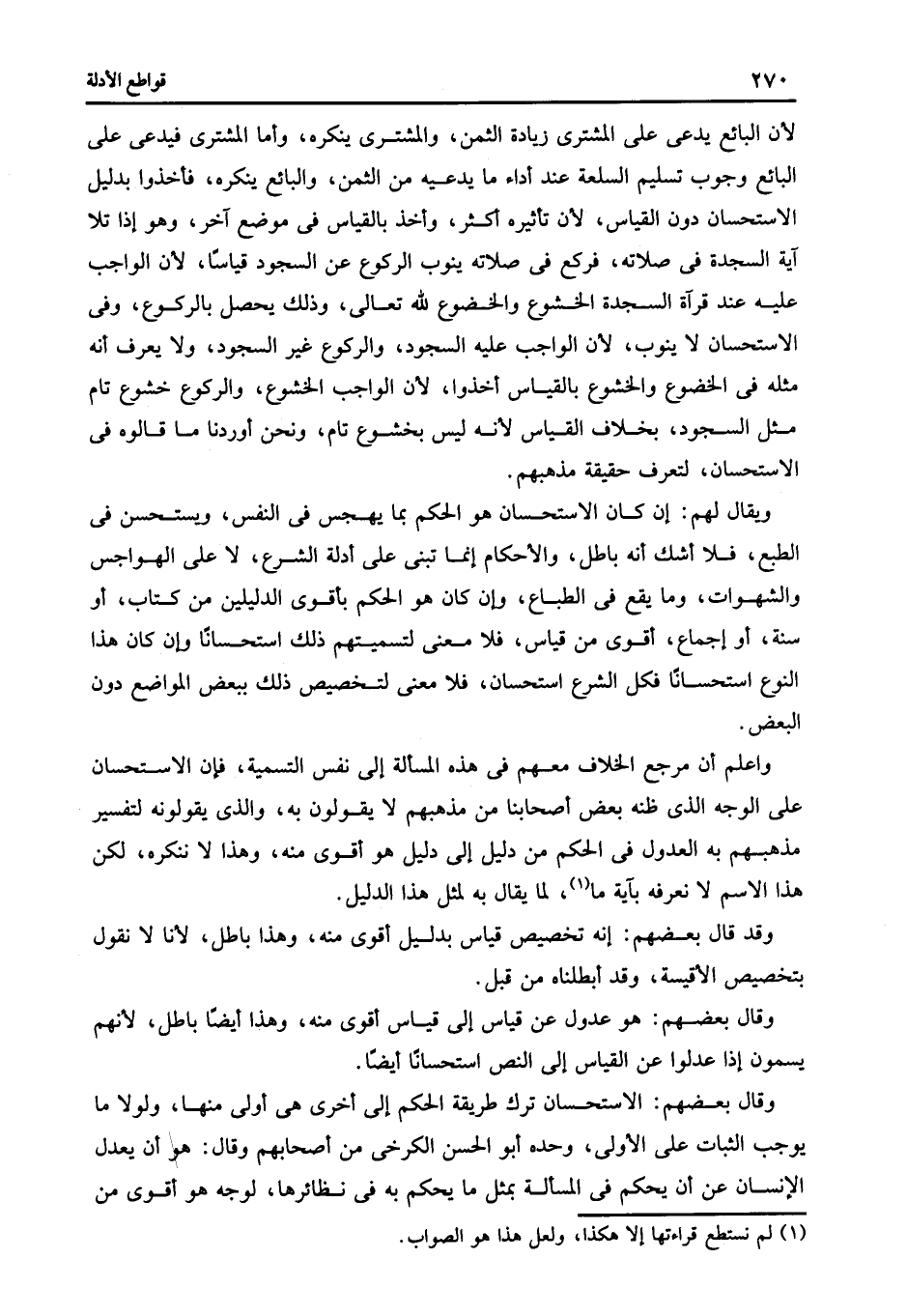 ويقال لهم: إن كان الاستحسان هو الحكم بما يهجس في النفس ويستحسن في الطبع فلا شك أنه باطل والأحكام إنما تبنى على أدلة الشرع لا على الهواجس والشهوات وما يقع في الطباع وإن كان هو الحكم بأقوى الدليلين من كتاب أو سنة أو إجماع أقوى من قياس فلا معنى لتسميتهم ذلك استحسانا ولإن كان هذا النوع استحسانا فكل الشرع استحسان فلا معنى لتخصيص ذلك ببعض المواضع دون البعض.