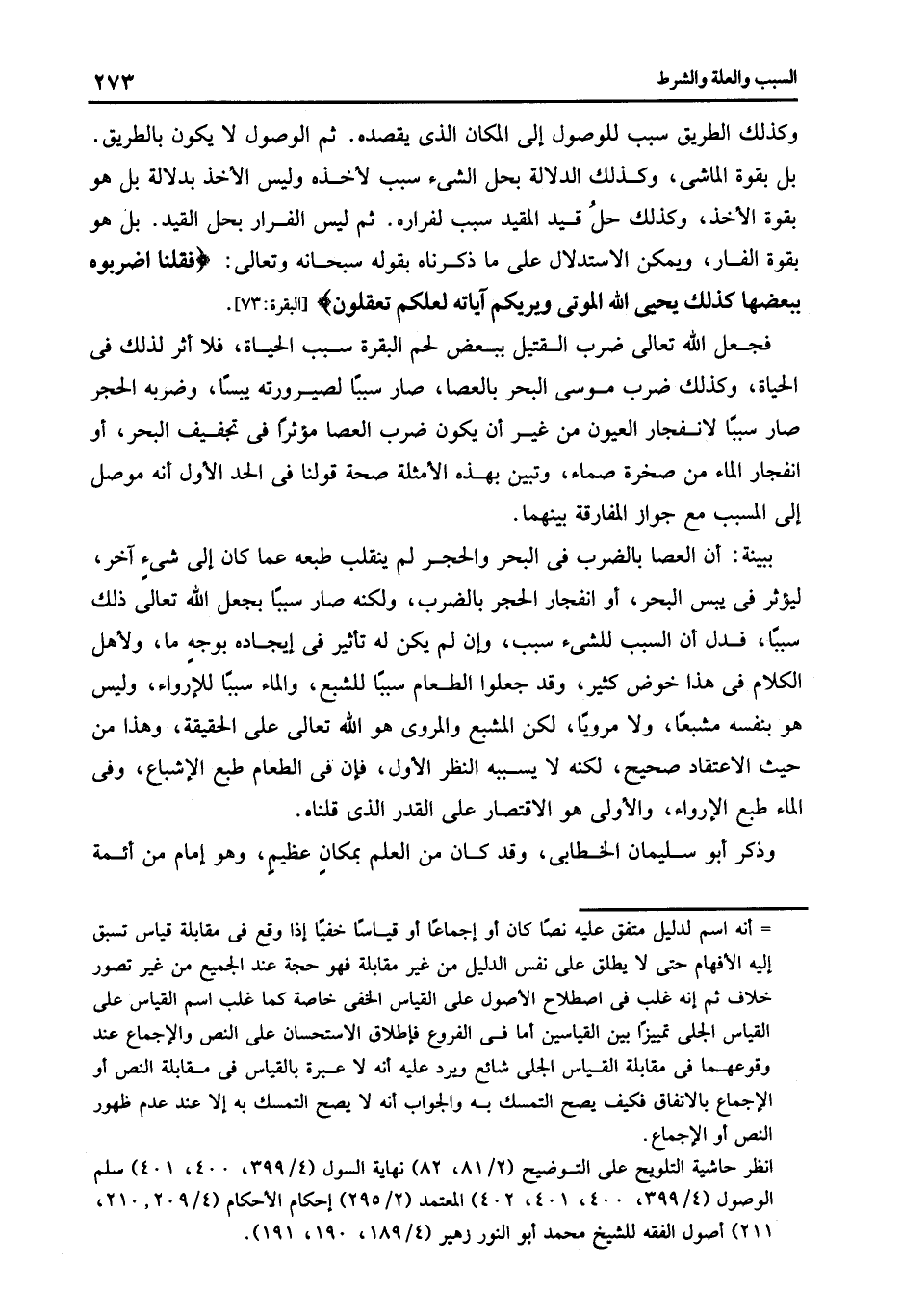 وكذلك الطريق سبب للوصول إلى المكان الذى يقصده ثم الوصول لا يكون بالطريق بل بقوة الماشى وكذلك الدلالة بحل الشىء سبب لأخذه وليس الأخذ بدلالة بل هو بقوة الأخذ وكذلك حل قيد المقيد سبب لفراره ثم ليس الفرار بحل القيد. بل هو بقوة الفار ويمكن الاستدلال على ما ذكرناه بقوله سبحانه وتعالى: {فَقُلْنَا اضْرِبُوهُ بِبَعْضِهَا كَذَلِكَ يُحْيِي اللَّهُ الْمَوْتَى وَيُرِيكُمْ آيَاتِهِ لَعَلَّكُمْ تَعْقِلُونَ} [البقرة: 73] .