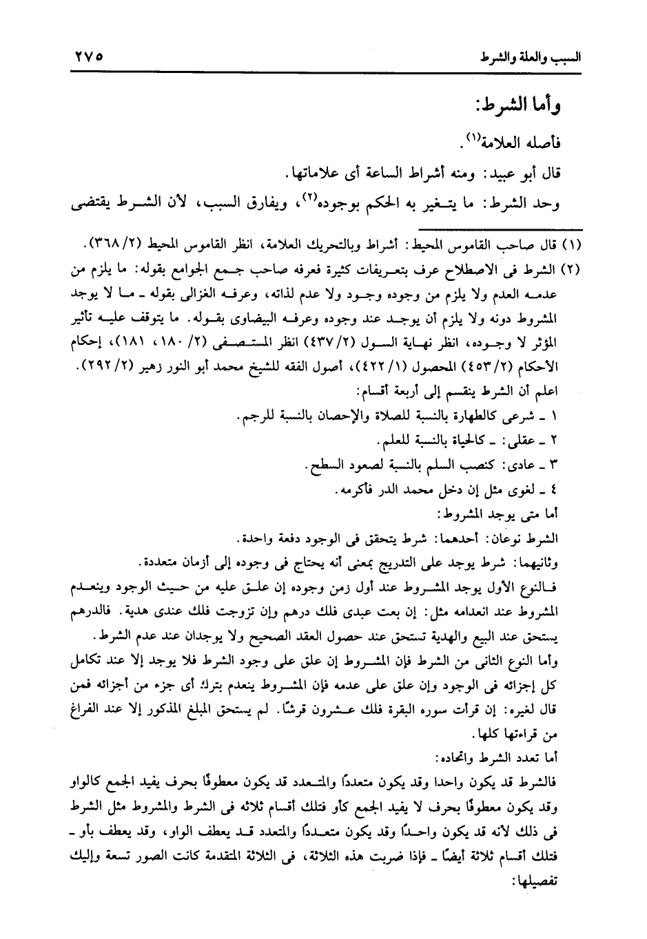 2 الشرط في الاصطلاح عرف بتعريفات كثيرة فعرفه صاحب جمع الجوامع بقوله: مايلزم من عدمه العدم ولا يلزم من وجوده وجود ولا عدم لذاته وعرفه الغزالي بقوله -ملا يوجد المشروط دونه ولا يلزم أن يوجد عند وجوده وعفه البيضاوي بقوله. ما يتوقف عليه تأثير المؤثؤ لا وجود له. انظر نهاية السول "2/437" انظر المستصفى "2/180, 181" إحكام الأحكام "2/453" المحصول "1/422" أصول الفقه للشيخ محمد أبو النور زهير "2/292".