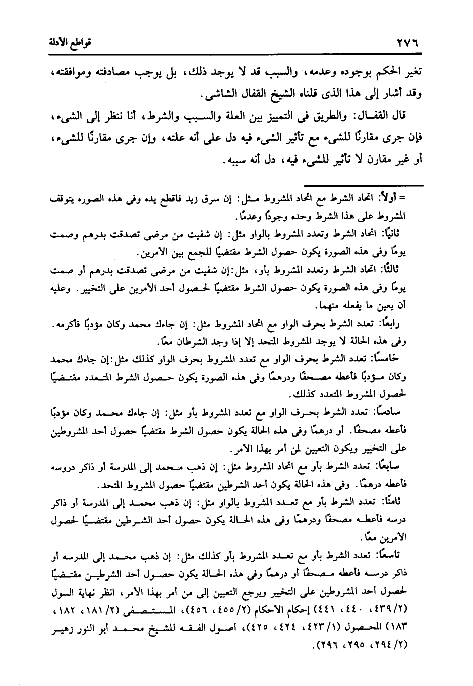 = أولا: اتحاد الشرط مع اتحاد المشروط مثل: إن سرق زيد فاقطع يده وفي هذه الصورة يتوقف المشروط على هذا الشرط وحده وجودا وعدما.