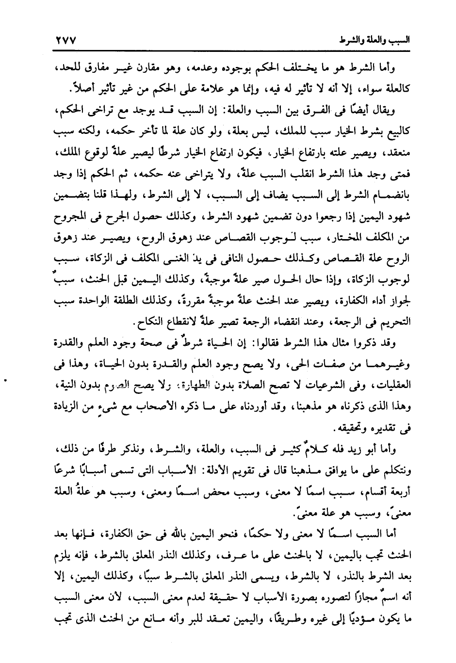 وقد ذكروا مثال هذا الشرط فقالوا: إن الحياة شرط في صحة وجود العلم والقدرة وغيرهما من صفات الحى ولا يصح وجود العلم والقدرة بدون الحياة وهذا في العقليات وفى الشرعيات لا تصح الصلاة بدون الطهارة ولا يصح الصوم بدون النية وهذا الذى ذكرناه هو مذهبنا وقد أوردناه على ما ذكره الأصحاب مع شئ من الزيادة في تقديره وتحقيقه.