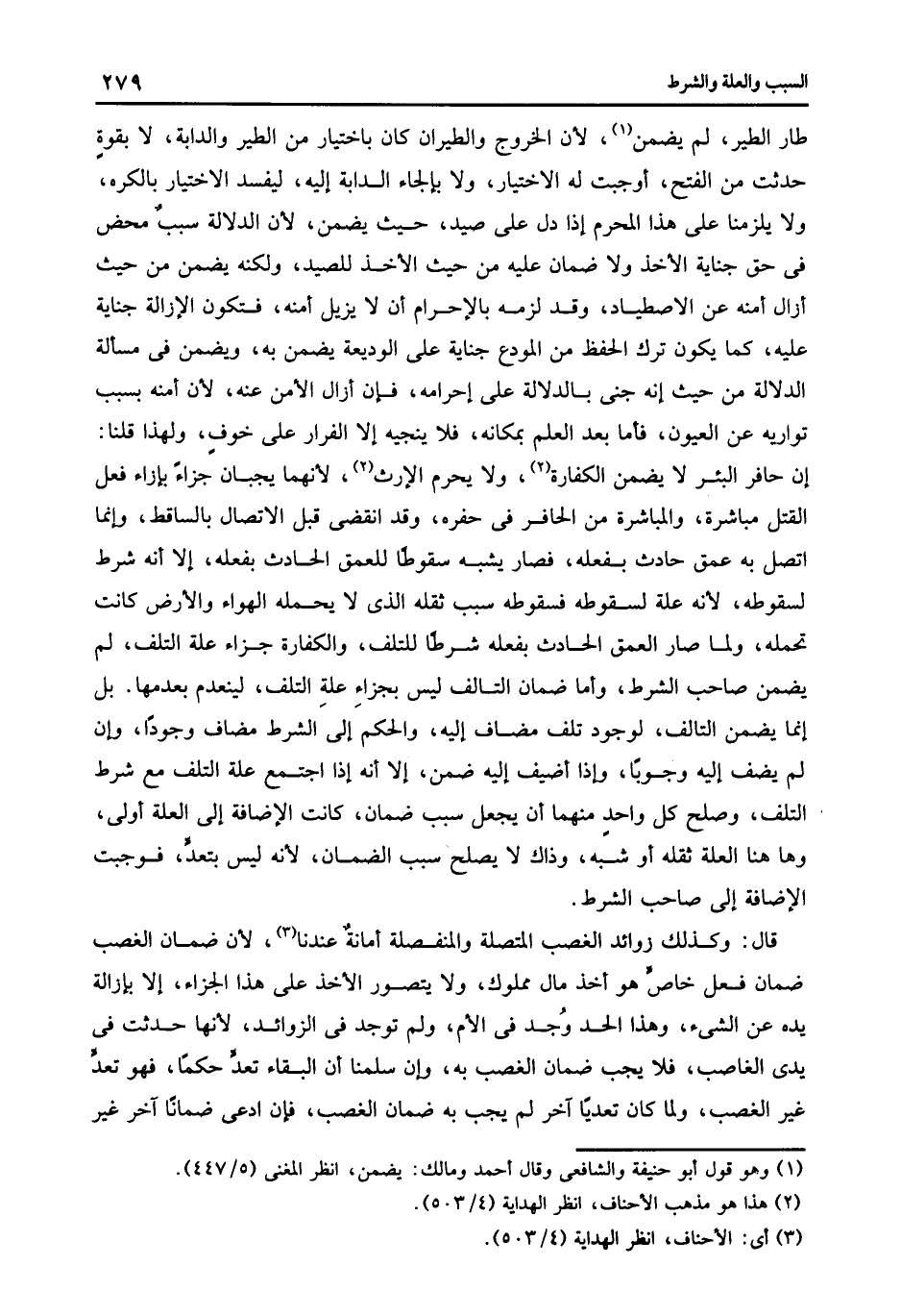 طار الطير لم يضمن1 لأن الخروج والطيران كان باختيار من الطير والدابة لا بقوة حدثت من الفتح أوجبت له الاختيار ولا بإلجاء الدابة إليه ليفسد الاختيار بالكره ولا يلزمنا على هذا المحرم إذا دل على صيد حيث يضمن لأن الدلالة سبب محض في حق جناية الأخذ ولا ضمان عليه من حيث الأخذ للصيد ولكنه يضمن من حيث أزال أمنه عن الاصطياد وقد لزمه بالإحرام أن لا يزيل أمنه فتكون الإزالة جناية عليه كما يكون ترك الحفظ من المودع جناية على الوديعة يضمن به ويضمن في مسألة الدلالة من حيث إنه جنى بالدلالة على إحرامه فإن أزال الأمن عنه لأن أمنه بسبب تواريه عن العيون فأما بعد العلم بمكانه فلا ينجيه إلا الفرار على خوف ولهذا قلنا: إن حافر البئر لا يضمن الكفارة2 ولا يحرم الإرث2 لأنهما يجبان جزاء بإزاء فعل القتل مباشرة والمباشرة من الحافر في حفره وقد انقضى قبل الاتصال بالساقط وإنما اتصل به عمق حادث بفعله فصار يشبه سقوطا للعمق الحادث بفعله إلا انه شرط لسقوطه لأنه علة لسقوطه فسقوطه سبب ثقله الذى لا يحمله الهواء والأرض كانت تحمله ولما صار العمق الحادث بفعله شرطا للتلف والكفارة جزاء علة التلف لم يضمن صاحب الشرط وأما ضمان التالف ليس بجزاء علة التلف لينعدم بعدمها بل إنما يضمن التالف لوجود تلف مضاف إليه والحكم إلى الشرط مضاف وجودا وإن لم يضف إليه وجوبا وإذا اضيف إليه ضمن إلا أنه إذا اجتمع علة التلف مع شرط التلف وصلح كل واحد منهما أن يجعل سبب ضمان كانت الإضافة إلى العلة أولى وها هنا العلة ثقله أو شبه وذاك لا يصلح سبب الضمان لأنه ليس بتعد فوجبت الإضافة إلى صاحب الشرط.