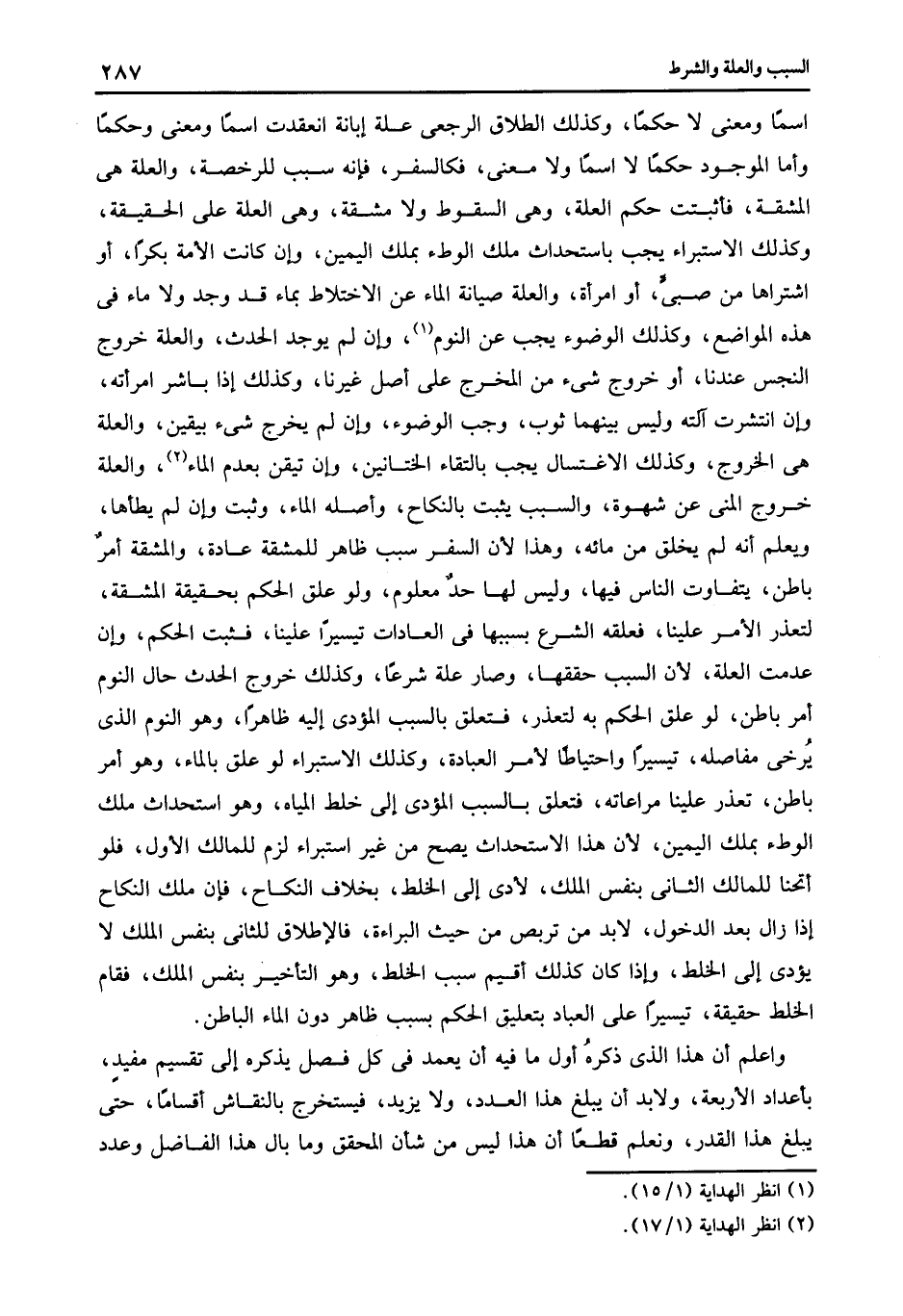 اسما ومعنى لا حكما وكذلك الطلاق الرجعى علة إبانه انعقدت اسما ومعنى وحكما وأما الموجود حكما لا اسما ولا معنى فكالسفر فإنه سبب للرخصة والعلة هى المشقة فأثبتت حكم العلة وهى السقوط ولا مشقة وهى العلة على الحقيقة وكذلك الاستبراء يجب باستحداث ملك الوطء بملك اليمين وإن كانت الأمة بكرا أو اشتراها من صبى أو امرأة والعلة صيانة الماء عن الاختلاط بماء قد وجد ولا ماء في هذه المواضع وكذلك الوضوء يجب عن النوم1 وإن لم يوجد الحدث والعلة خروج النجس عندنا أو خروج شئ من المخرج على أصل غيرنا وكذلك إذا باشر امرأته وإن انتشرت آلته وليس بينهما ثوب وجب الوضوء وإن لم يخرج شئ بيقين والعلة هى الخروج وكذلك الاغتسال يجب بالتقاء الختانين وإن تيقن بعدم الماء2 والعلة خروج المنى عن شهوة والسبب يثبت بالنكاح وأصله الماء وثبت وإن لم يطأها ويعلم أنه لم يخلق من مائه وهذا لأن السفر سبب ظاهر للمشقة عادة والمشقة أمر باطن يتفاوت الناس فيها وليس لها حد معلوم ولو علق الحكم بحقيقة المشقة لتعذر الأمر علينا فعلته الشرع بسببها في العادات تيسيرا علينا فثبت الحكم وإن عدمت العلة لأن السبب حققها وصار علة شرعا وكذلك خروج الحدث حال النوم أمر باطن لو علق الحكم به لتعذر فتعلق بالسبب المؤدى إليه ظاهرا وهو النوم الذى يرخى مفاصله تيسيرا واحتياطا لأمر العبادة وكذلك الاستبراء لو علق بالماء وهو أمر باطن تعذر علينا مراعاته فتعلق بالسبب المؤدى إلى خلط المياه وهو استحداث ملك الوطء بملك اليمين لأن هذا الاستحداث يصح من غير استبراء لزم للمالك الأول فلو أتحنا للمالك الثانى بنفس الملك لأدى إلى الخلط بخلاف النكاح فإن ملك النكاح إذا زال بعد الدخول لابد من تربص من حيث البراءة فالإطلاق للثانى بنفس الملك لا يؤدى إلى الخلط وإذا كان كذلك أقيم سبب الخلط وهو التأخير بنفس الملك فقام الخلط حقيقة تيسيرا على العباد بتعليق الحكم بسبب ظاهر دون الماء الباطن.