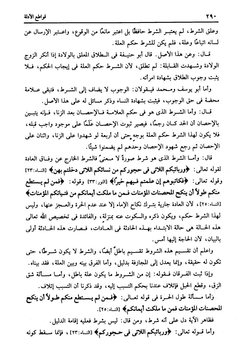 قال: وأما الشرط الذى هو شرط صورة لا معنى فالشرط الخارج عن وفاق العادة لقوله تعالى: {وَرَبَائِبُكُمُ اللَّاتِي فِي حُجُورِكُمْ مِنْ نِسَائِكُمُ اللَّاتِي دَخَلْتُمْ بِهِنَّ} [النساء: 23] "وقوله تعالى: {فَكَاتِبُوهُمْ إِنْ عَلِمْتُمْ فِيهِمْ خَيْراً} [النور: 33] "وقوله: {وَمَنْ لَمْ يَسْتَطِعْ مِنْكُمْ طَوْلاً أَنْ يَنْكِحَ الْمُحْصَنَاتِ الْمُؤْمِنَاتِ فَمِنْ مَا مَلَكَتْ أَيْمَانُكُمْ مِنْ فَتَيَاتِكُمُ الْمُؤْمِنَاتِ} [النساء: 25] "لأن العادة جارية بترك نكاح الإماء إلا عند عدم الحرة والعجز عنها وليس لهذا الشرط حكم ويكون ذكره والسكوت عنه بمنزلة والفائدة في تخصيص الله تعالى هذه الحالة هى حالة الابتداء بهذه الحادثة في العادات فصارت هذه الحادثة أولى بالبيان لأن الحاجة إليها أمس.