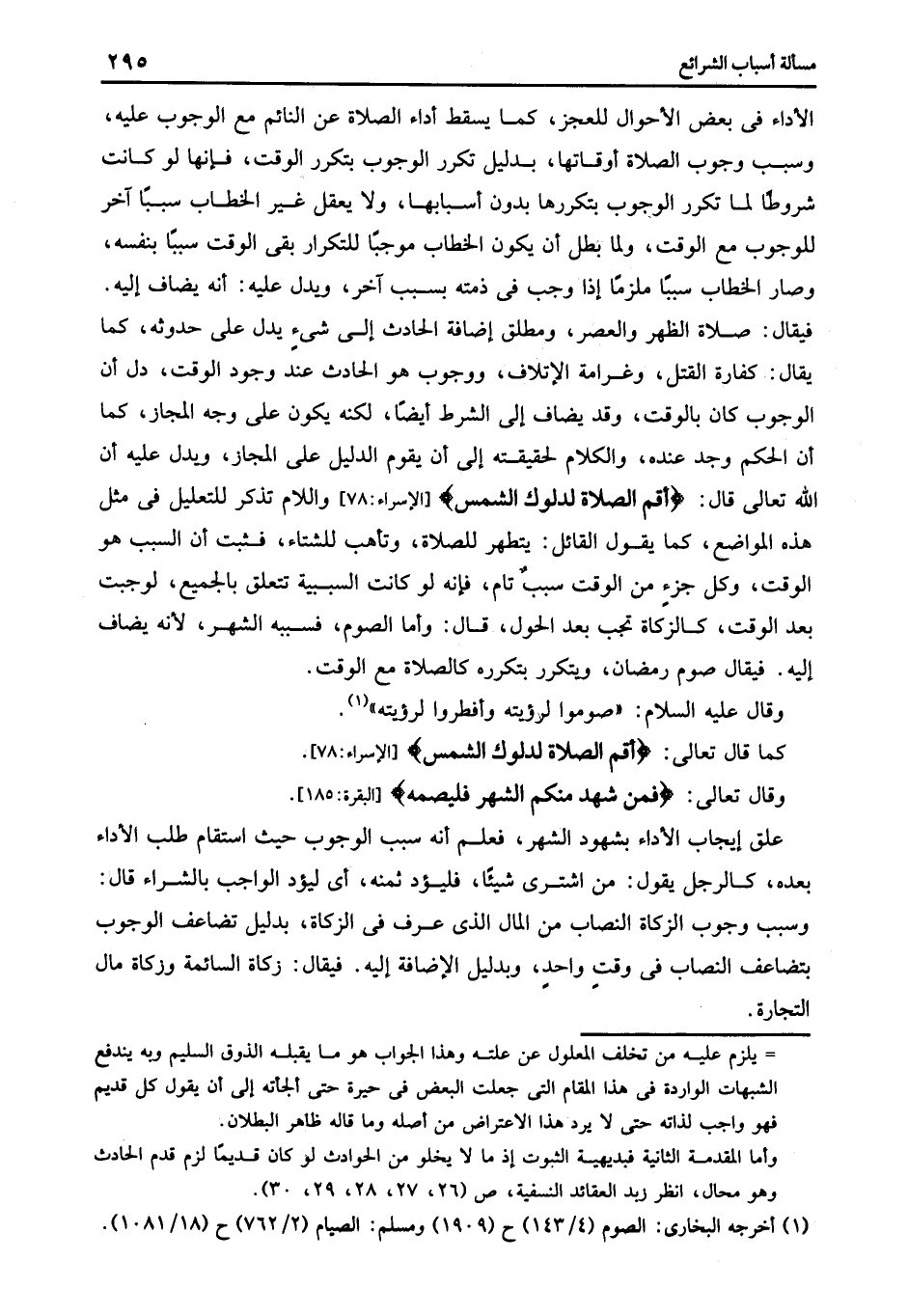 فيقال: صلاة الظهر والعصر ومطلق إضافة الحادث إلى شئ يدل على حدوثه كما يقال: كفارة القتل وغرامة الإتلاف ووجوب هو الحادث عند وجود الوقت دل أن الوجوب كان بالوقت وقد يضاف إلى الشرط أيضا لكنه يكون على وجه المجاز كما أن الحكم وجد عنده والكلام لحقيقته إلى أن يقوم الدليل على المجاز ويدل عليه أن الله تعالى قال: {أَقِمِ الصَّلاةَ لِدُلُوكِ الشَّمْسِ} [الإسراء: 78] واللام تذكر للتعليل في مثل هذه المواضع كما يقول القائل: يتطهر للصلاة وتأهب للشتاء فثبت أن السبب هو الوقت وكل جزء من الوقت سبب تام فإنه لو كانت السببية تتعلق بالجميع لوجبت بعد الوقت كالزكاة تجب بعد الحول قال: وأما الصوم فسببه الشهر لأنه يضاف إليه فيقال صوم رمضان ويتكرر بتكرره كالصلاة مع الوقت.