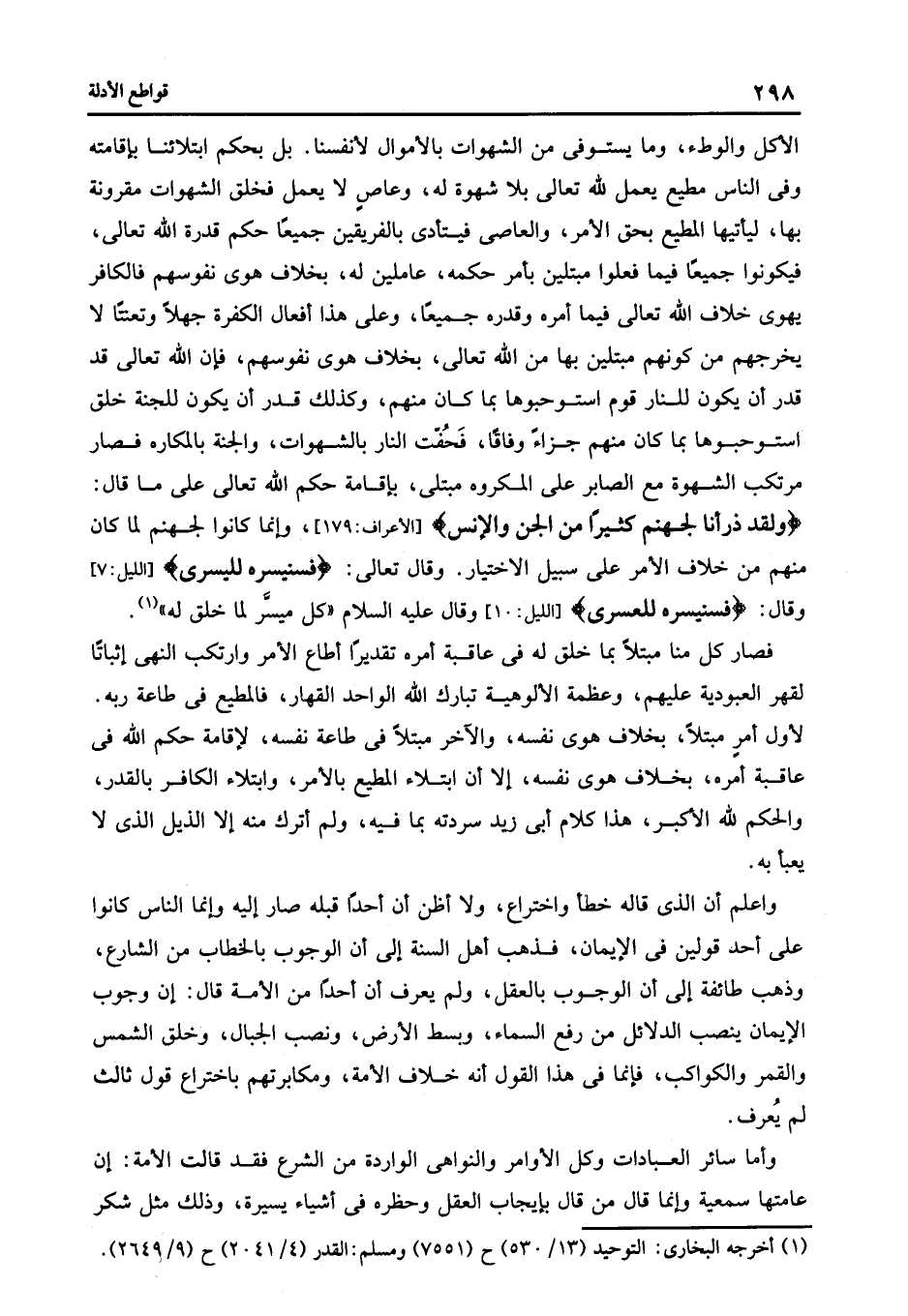 الأكل والوطء وما يسستوفي من الشهوات بالأموال لأنفسنا. بل بحكم ابتلائنا بإقامته وفى الناس مطيع يعمل لله تعالى بلا شهوة له وعاص لا يعمل فخلق الشهوات مقرونة بها ليأتيها المطيع بحق الأمر والعاصى فيتأدى بالفريقين جميعا حكم قدرة الله تعالى فيكونوا جميعا فيما فعلوا مبتلين بأمر حكمه عاملين له بخلاف هوى نفوسهم فالكافر يهوى خلاف الله تعالى فيما أمره وقدره جميعا وعلى هذا أفعال الكفرة جهلا وتعنتا لا يخرجهم من كونهم مبتلين بها من الله تعالى بخلاف هوى نفوسهم فإن الله تعالى قد قدر أن يكون للنار قوم استوحبوها بما كان منهم وكذلك قدر أن يكون للجنة خلق استوحبوها بما كان منهم جزاء وفاقا فحفت النار بالشهوات والجنة بالمكاره فصار مرتكب الشهوة مع الصابر على المكروه مبتلى بإقامة حكم الله تعالى على ما قال: {وَلَقَدْ ذَرَأْنَا لِجَهَنَّمَ كَثِيراً مِنَ الْجِنِّ وَالْأِنْسِ} [الأعراف: 179] كثيرا من الجن والإنس وإنما كانوا لجهنم لما كان منهم من خلاف الأمر على سبيل الاختيار وقال تعالى: {فَسَنُيَسِّرُهُ لِلْيُسْرَى} [الليل: 7] وقال {فَسَنُيَسِّرُهُ لِلْعُسْرَى} [الليل: 10] وقال صلى الله عليه وسلم: "كل ميسر لما خلق له" 1.