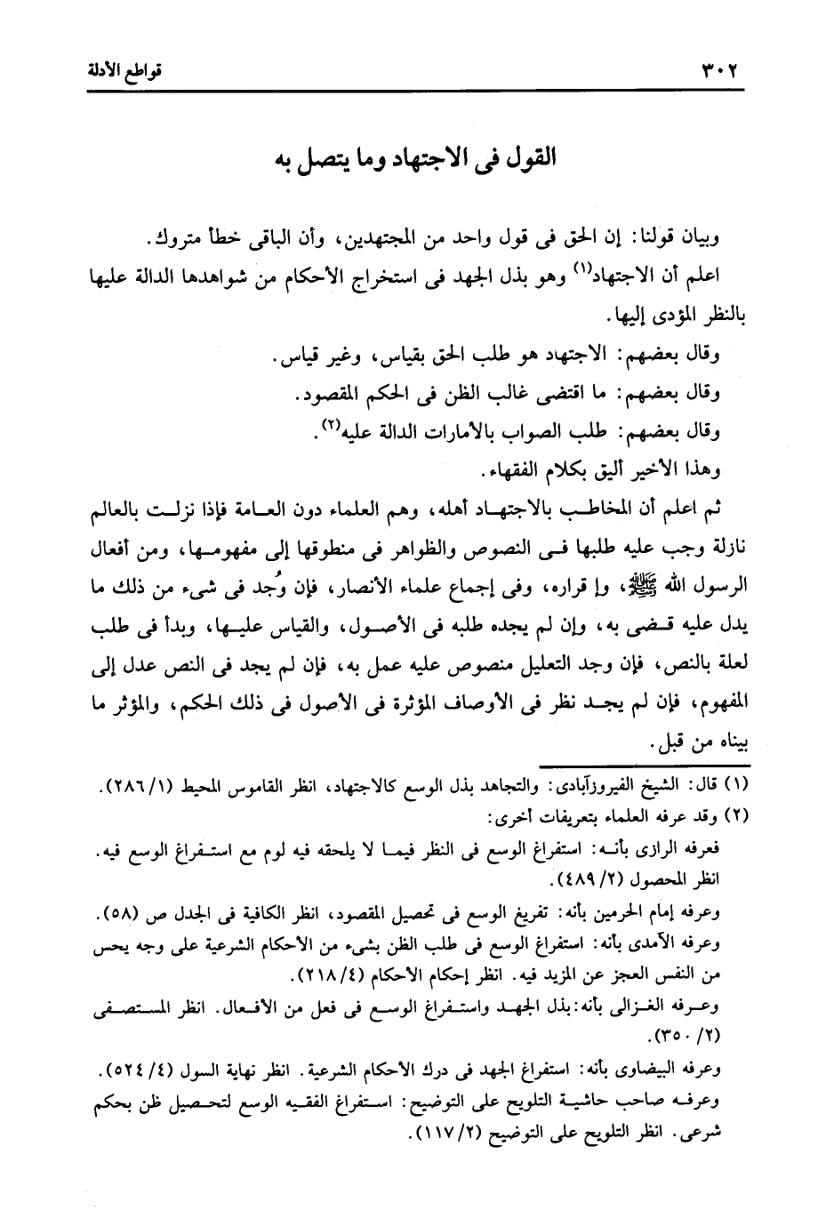 وعرفه إمام الحرمين بأنه: تفريغ الوسع في تحصي المقصود انظر الكافية في الجدل ص 58.