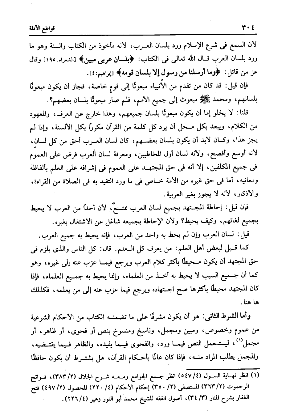 قلنا: لا يخلو إما أن يكون مبعوثا بلسان جميعهم وهذا خارج عن العرف والمعهود من الكلام ويبعد بكل محل أن يرد كل كلمة من القرآن مكررا بكل الألسنة وإذا لم يجز هذا وكان لابد أن يكون بلسان بعضهم كان لسان العرب أحق من كل لسان لأنه أوسع وأفصح ولأنه لسان أول المخاطبين ومعرفة لسان العرب فرض على العموم في جميع المكلفين إلا أنه في حق المجتهد على العموم في إشرافه على العلم بألفاظه ومعانيه أما في حق غيره من الأمة خاص في ما ورد التقيد به في الصلاة من القراءة والأذكار لأنه لا يجوز بغير العربية.