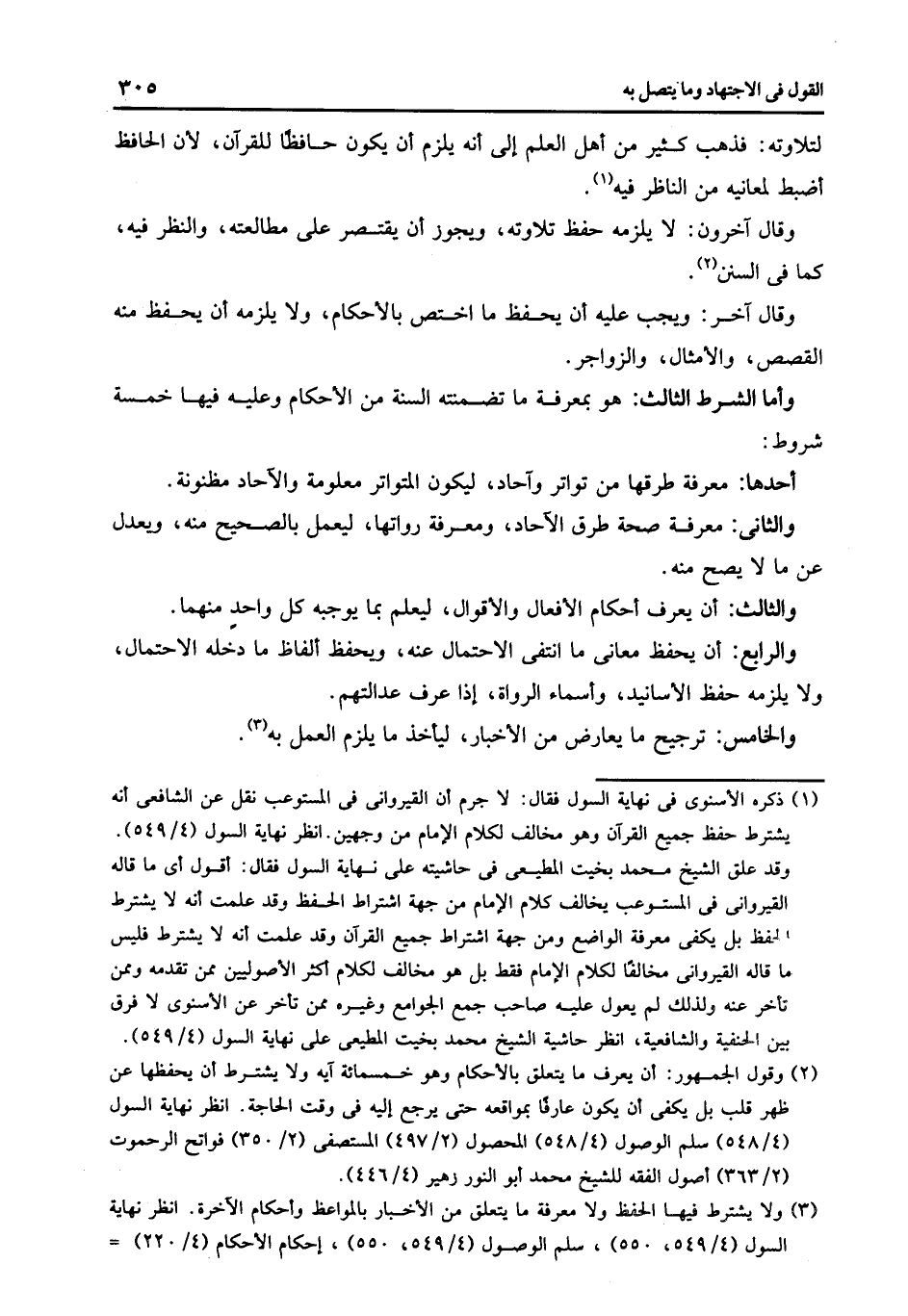 3 ولا يشترط فيها الحفظ ولا معرفة ما يتعلق من الأخبار بالمواعظ وأحكام الآخرة. انظر نهاية السول "4/549, 550" سلم الوصول "4/549, 550" إحكام الأحكام "4/220" المحصول "2/498" فواتح الرحموت "2/363" المستصفى "2/351" أصول الفقه للشيخ محمد أبو النور زهير "4/226".