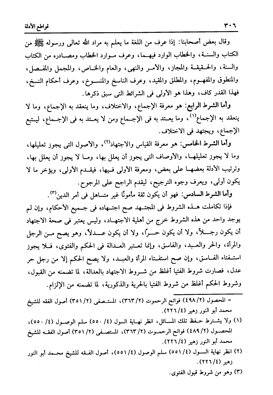 وأما الشرط الخامس: هو معرفة القياس والاجتهاد2 والأصول التي يجوز تعليلها وما لا يجوز تعليلها والأوصاف التي يجوز أن يعلل بها وما لا يجوز أن يعلل بها وترتيب الأدلة بعضها على بعض ومعرفة الأولى فيها فيقدم الأولى ويؤخر ما لا يكون أولى ويعرف وجوه الترجيح ليقدم الراجح على المرجوح