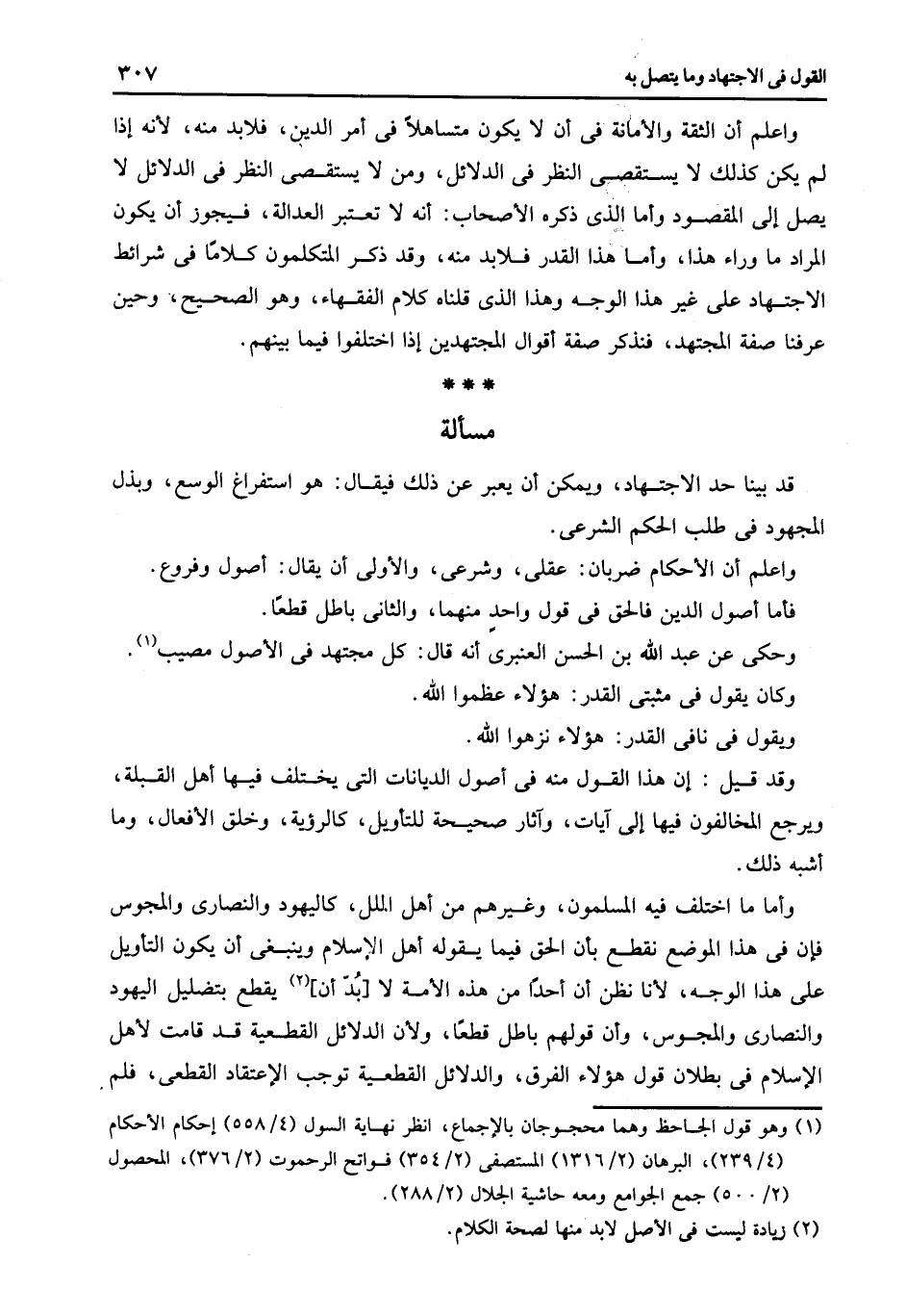 واعلم أن الثقة والأمانة في أن لا يكون متساهلا في أمر الدين فلابد منه لأنه إذا لم يكن كذلك لا يستقصى النظر في الدلائل ومن لا يستقصى النظر في الدلائل لا يصل إلى المقصود وأما الذى ذكره الأصحاب أنه لا تعتبر العدالة فيجوز أن يكون المراد ما وراء هذا وأما هذا القدر فلابد منه وقد ذكر المتكلمون كلاما في شرائط الاجتهاد على غيرهذا الوجه وهذا الذى قلناه كلام االفقهاء وهو الصحيح وحين عرفنا صفة المجتهد فنذكر صفة أقوال المجتهدين إذا اختلفوا فيما بينهم.