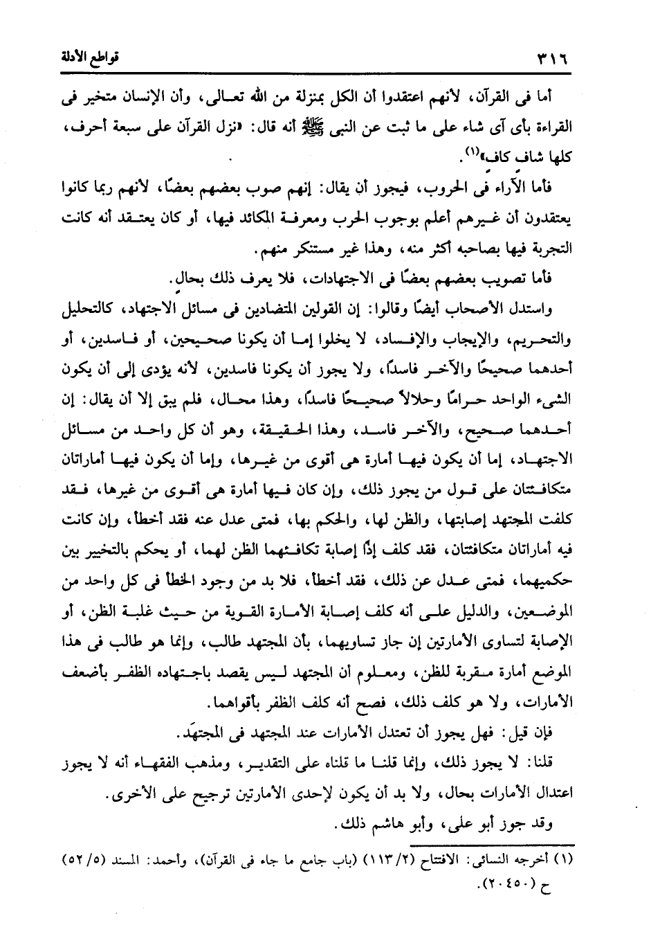 أما في القرآن لأنهم اعتقدوا أن الكل بمنزلة من الله تعالى وأن الإنسان متخير في القراءة بأى آي شاء على ما ثبت عن النبى صلى الله عليه وسلم أنه قال: "نزل القرآن على سبعة أحرف كلها شاف كاف" 1.