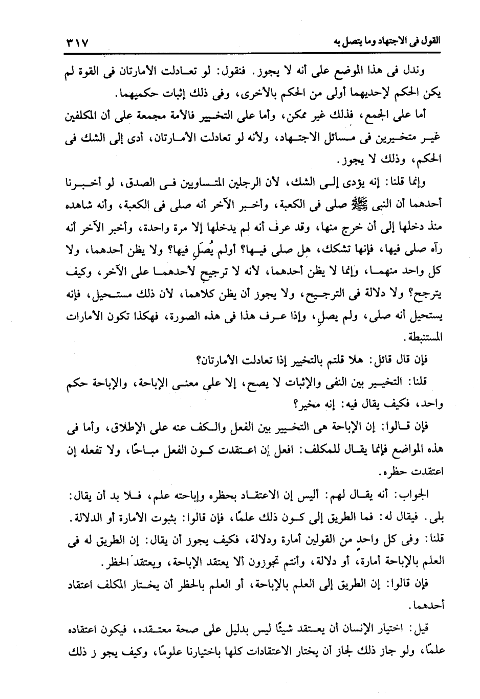 وإنما قلنا: إنه يؤدى إلى الشك لأن الرجلين المتساويين في الصدق لو أخبرها أحدهما أن النبى صلى الله عليه وسلم صلى في الكعبة وأخبر الآخر أنه صلى في الكعبة وأنه شاهده منذ دخلها إلى أن خرج منها وقد عرف أنه لم يدخلها إلا مرة واحده وأخبر الآخر انه رآه صلى فيها فإنها تشكك هل صلى فيها أو لم يصل فيها ولا يظن أحدهما ولا كل واحد منهما وإنما لا يظن أحدهما لأنه لا ترجيح لأحدهما على الآخر وكيف يترجح ولا دلالة في الترجيح ولا يجوز أن يظن كلاهما لأن ذلك مستحيل فإنه يستحيل أنه صلى ولم يصل وإذا عرف هذا في هذه الصورة فهكذا تكون الأمارات المستنبطة.