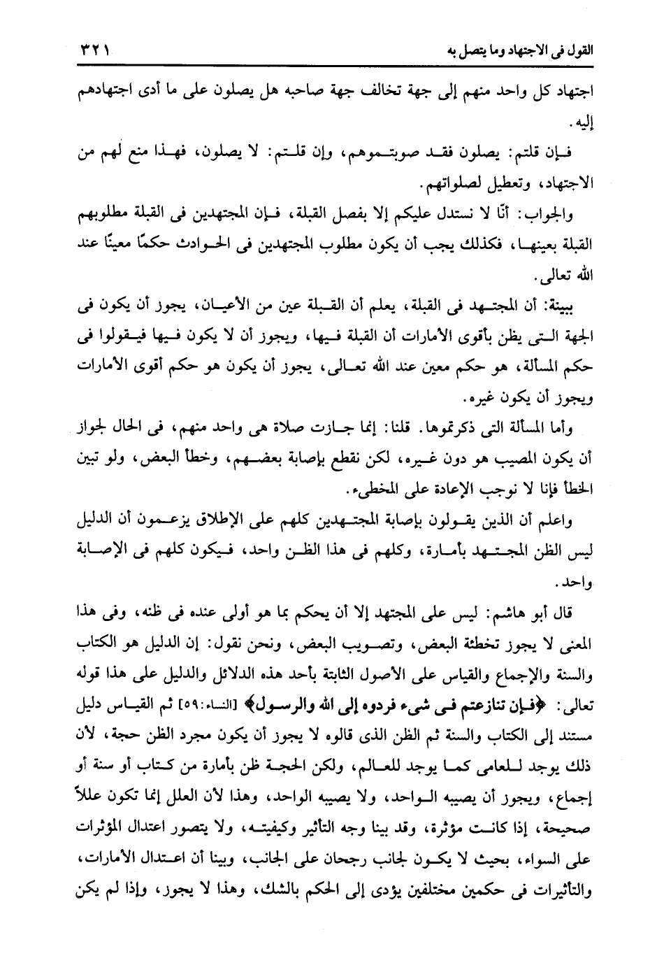 قال أبو هاشم: ليس على المجتهد إلا أن يحكم بما هو أولى عنده في ظنه وفى هذا المعنى لا يجوز تخطئة البعض وتصويب البعض ونحن نقول: إن الدليل هو الكتاب والسنة والإجماع والقياس على الأصول الثابتة بأحد هذه الدلائل والدليل على هذا قوله تعالى: {فَإِنْ تَنَازَعْتُمْ فِي شَيْءٍ فَرُدُّوهُ إِلَى اللَّهِ وَالرَّسُولِ} [النساء: 59] ثم القياس دليل مستند إلى الكتاب والسنة ثم الظن الذى قالوه لا يجوز أن يكون مجرد الظن حجة لأن ذلك يوجد للعامى كما يوجد للعالم ولكن الحجة ظن بأمارة من كتاب أو سنة أو إجماع ويجوز أن يصيبه الواحد ولا يصيبه الواحد وهذا لأن العلل إنما تكون عللا صحيحة إذا كانت مؤثرة وقد بينا وجه التأثير وكيفيته ولا يتصور اعتدال المؤثرات على السواء بحيث لا يكون لجانب رجحان على الجانب وبينا أن اعتدال الأمارات والتأثيرات في حكمين مختلفين يؤدى إلى الحكم بالشك وهذ لا يجوز وإذا لم يكن