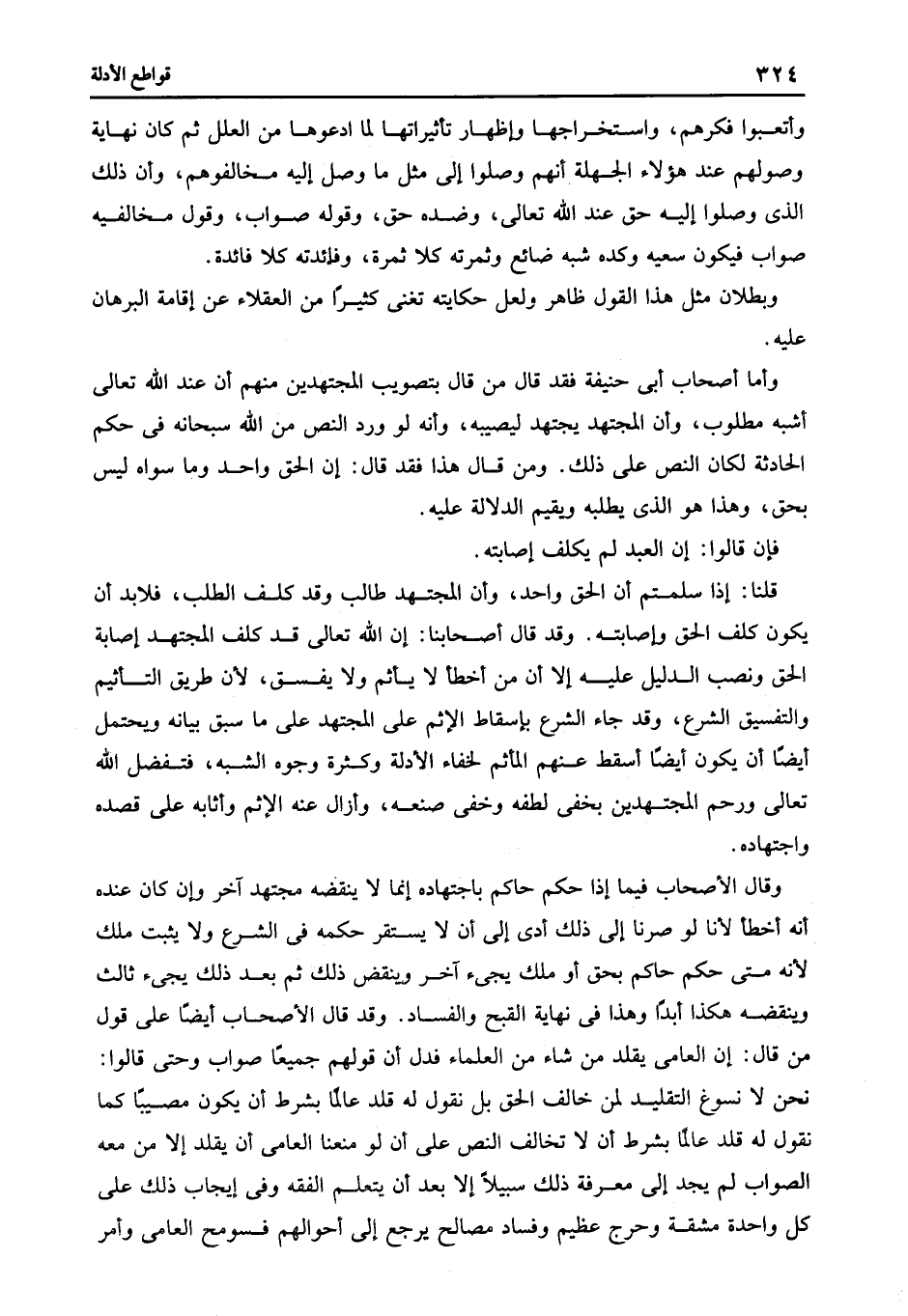 وقال الأصحاب فيما إذا حكم حاكم باجتهاده إنما لا ينقضه مجتهد آخر وإن كان عنده أنه أخطأ لأنا لو صرنا إلى ذلك أدى إلى أن لا يستقر حكمه في الشرع ولا يثبت ملك لأنه متى حكم حاكم بحق أو ملك يجئ آخر وينقض ذلك ثم بعد ذلك يجئ ثالث وينقضه هكذا أبدا وهذا في نهاية القبح والفساد. وقد قال الأصحاب أيضا: على قول من قال: إن العامى يقلد من شاء من العلماء فدل أن قولهم جميعا صواب وحتى قالوا: نحن لا نسوغ التقليد لمن خالف الحق بل نقول له قلد عالما بشرط أن يكون مصيبا كما نقول له قلد عالما بشرط أن لا تخالف النص على أن لو منعنا العامى أن يقلد إلا من معه الصواب لم يجد إلى معرفة ذلك سبيلا إلا بعد أن يتعلم الفقه وفى إيجاب ذلك على كل واحدة مشقة وحرج عظيم وفساد مصاح يرجع إلى أحوالهم فسومح العامى وأمر