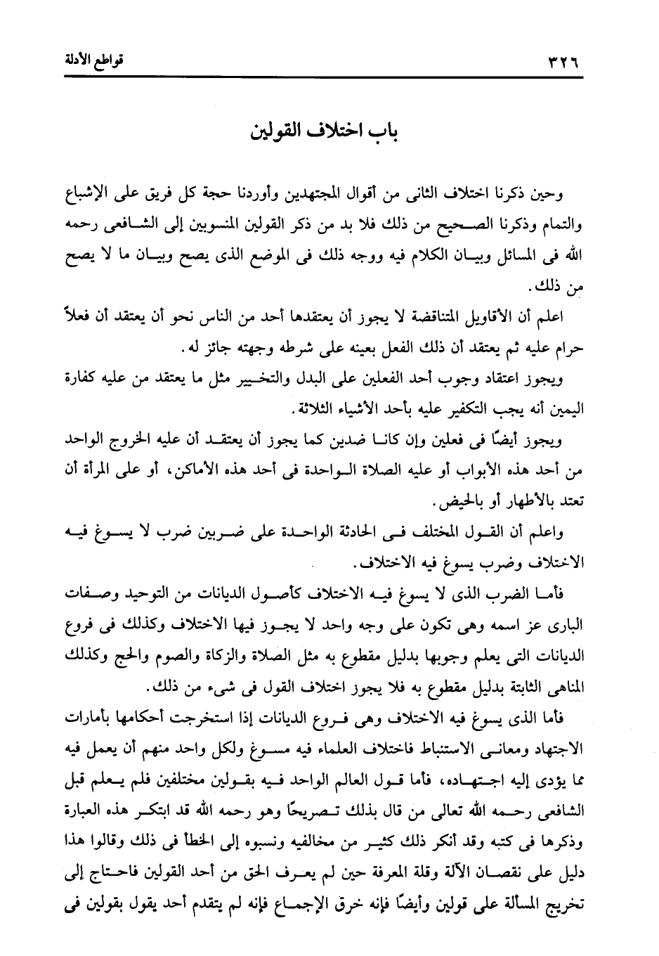 فأما الضرب الذى لا يسوغ فيه الاختلاف كأصول الديانات من التوحيد وصفات البارى عز اسمه وهى تكون على وجه واحد لا يجوز فيها الاختلاف وكذلك في فروع الديانات التي يعلم وجوبها بدليل مقطوع به مثل الصلاة والزكاة والصوم والحج وكذلك المناهى الثابته بدليل مقطوع به فلا يجوز اختلاف القول في شئ من ذلك.
