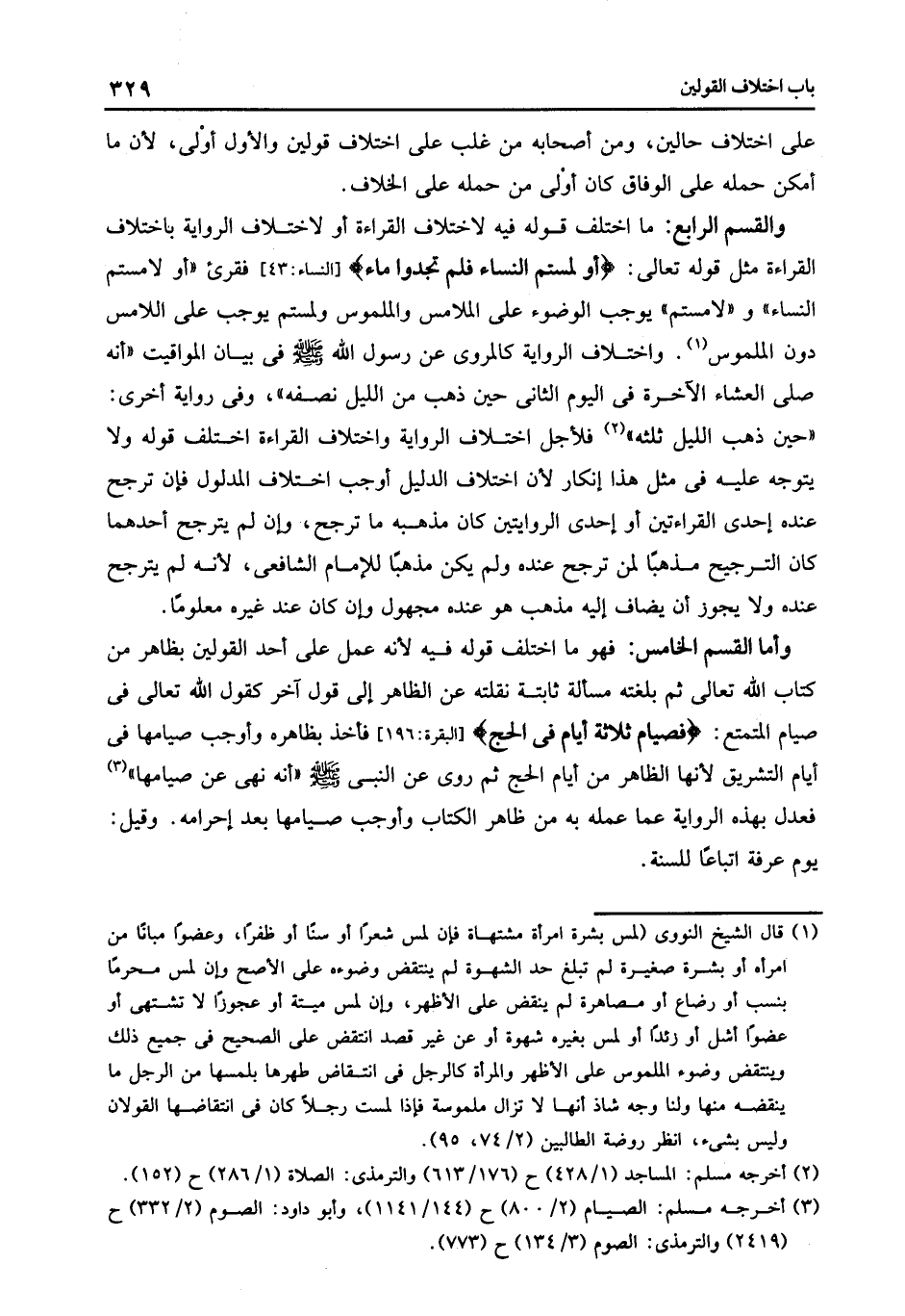 والقسم الرابع: ما اختلف قوله فيه لاختلاف القراءة أو لاختلاف الرواية باختلاف القراءة مثل قوله تعالى: {أَوْ لمَسْتُمُ النِّسَاءَ فَلَمْ تَجِدُوا مَاءً} [النساء: 43] فقرئ "أو لامستم النساء" و "لامستم" يوجب الوضوء على الملامس والملموس ولمستم يوجب على اللامس دون الملموس1. واختلاف الرواية كالمروي عن رسول الله صلى الله عليه وسلم في بيان المواقيت أنه صلى العشاء الآخرة في اليوم الثاني حين ذهب من الليل نصفه وفى رواية أخرى: حين ذهب الليل ثلثه2 فلأجل اختلاف الرواية واختلاف القراءة اختلف قوله ولا يتوجه عليه في مثل هذا إنكار لأن اختلاف الدليل أوجب اختلاف المدلول فإن ترجح عنده إحدى القراءتين أو إحدى الروايتين كان مذهبه ما ترجح وإن لم يترجح أحدهما كان الترجيح مذهبا لمن ترجح عنده ولم يكن مذهبا للإمام الشافعى لأنه لم يترجح عنده ولا يجوز أن يضاف إليه مذهب هو عنده مجهول وإن كان عند غيره معلوما.