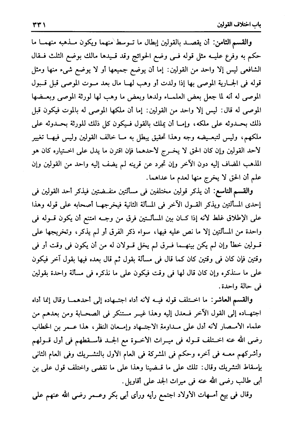 والقسم العاشر: ما اختلف قوله فيه لأنه أداه اجتهاده إلى أحدهما وقال إنما أداه اجتهاده إلى القول الآخر فعدل إليه وهذا غير مستنكر في الصحابة ومن بعدهم من علماء الأمصار لأنه أدل على مداومة الاجتهاد وإمعان النظر هذا عمر بن الخطاب رضى الله عنه اختلف قوله في ميراث الأخوة مع الجد فأسقطهم في أول قولهم وأشركهم معه في آخره وحكم في المشركة في العام الأول بالتشريك وفى العام الثانى بإسقاط التشريك وقال تلك على ما قضينا وهذا على ما نقضى واختلف قول على بن أبى طالب رضى الله عنه في ميراث الجد على أقاويل.