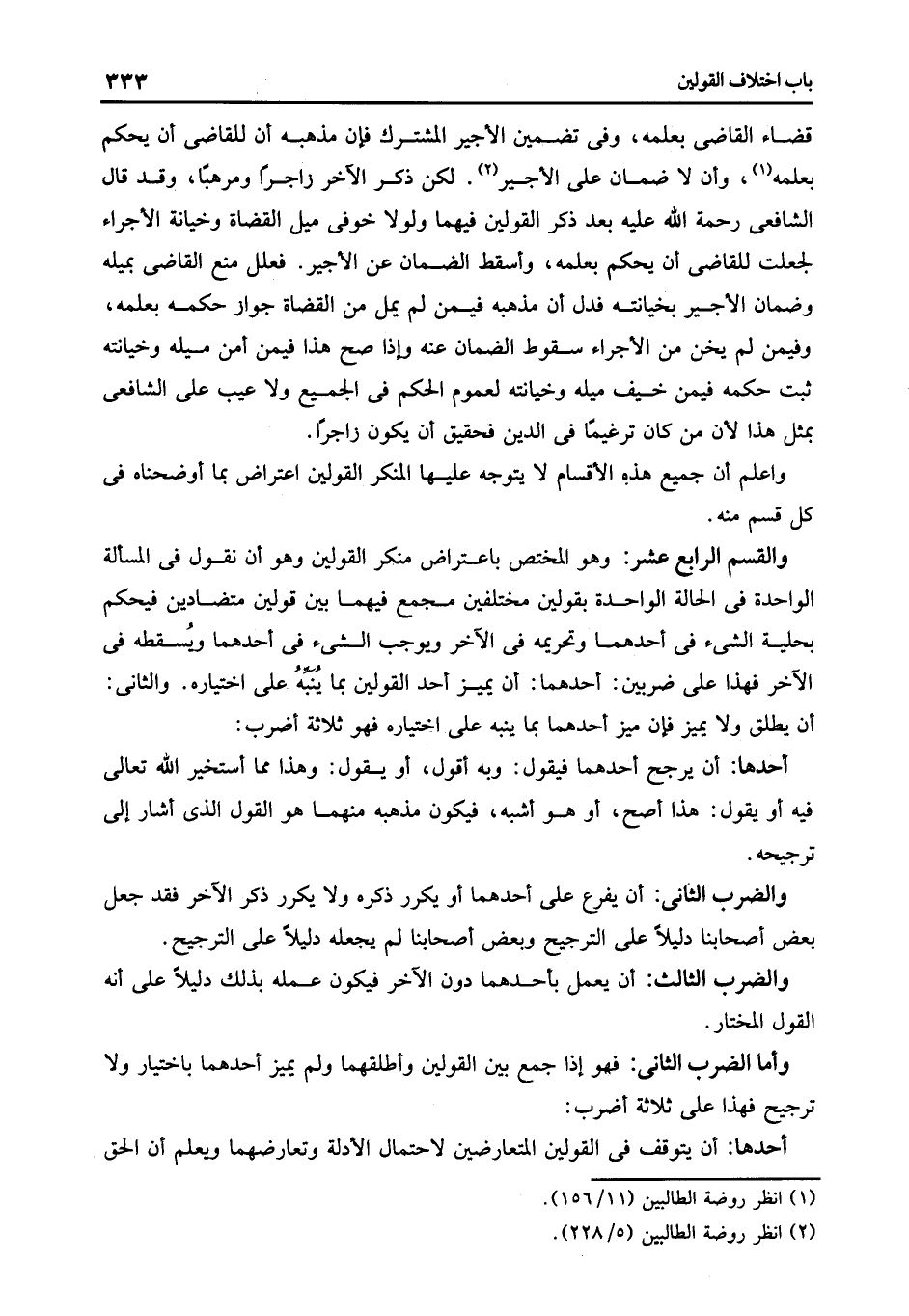 والقسم الرابع عشر: وهو المختص باعتراض منكر القولين وهو أن نقول في المسألة الواحدة في الحالة الواحدة بقولين مختلفين مجمع فيهما بين قولين متضادين فيحكم بحلية الشئ في أحدهما وتحريمه في الآخر ويوجب الشئ في أحدهما ويسقطه في الآخر فهذا على ضربين أحدهما أن يميز أحد القولين بما ينبه على اختياره. والثاني: أن يطلق ولا يميز فإن ميز أحدهما بما ينبه على اختياره فهو ثلاثة أضرب: