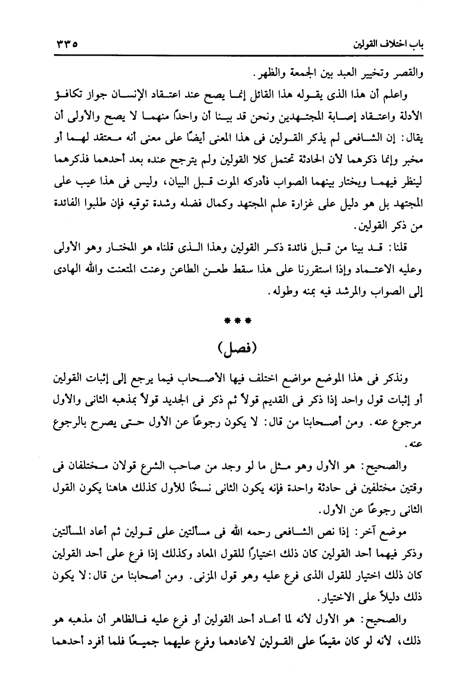 موضع آخر: إذا نص الشافعى رحمه الله في مسألتين على قولين ثم أعاد المسألتين وذكر فيهما أحد القولين كان ذلك اختيارا للقول المعاد وكذلك إذا فرع على أحد القولين كان ذلك اختيار للقول الذى فرع عليه وهو قول المزنى. ومن أصحابنا من قال: لا يكون ذلك دليلا على الاختيار.
