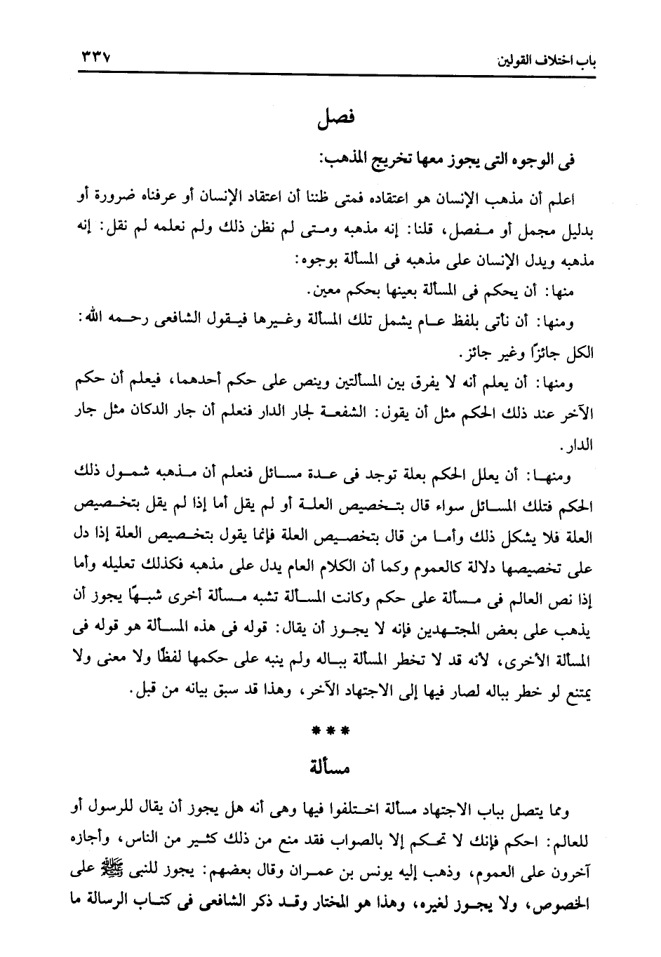 ومنها: أن يعلل الحكم بعلة توجد في عدة مسائل فنعلم أن مذهبه شمول ذلك الحكم فتلك المسائل سواء قال بتخصيص العلة أو لم يقل أما إذا لم يقل بتخصيص العلة فلا يشكل ذلك وأما من قال بتخصيص العلة فإنما يقول بتخصيص العلة إذا دل على تخصيصها دلالة كالعموم وكما أن الكلام العام يدل على مذهبه فكذلك تعليله وأما إذا نص العالم في مسألة على حكم وكانت المسألة تشبه مسألة أخرى شبها يجوز أن يذهب على بعض المجتهدين فإنه لا يجوز أن يقال: قوله في هذه المسألة هو قوله في المسألة الأخرى لأنه قد لا تخطر المسألأة بباله ولم ينبه على حكمها لفظا ولا معنى ولا يمتنع لو خطر بباله لصار فيها إلى الاجتهاد الآخر وهذا قد سبق بيانه من قبل.