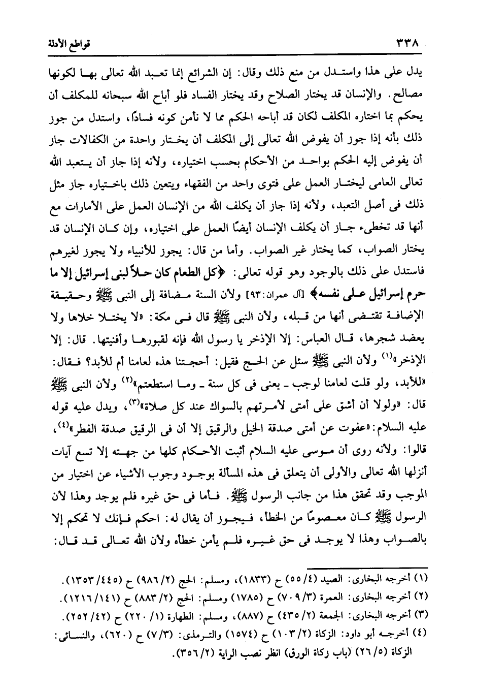 والإنسان قد يختار الصلاح وقد يختار الفساد فلو أباح الله سبحانه للمكلف أن يحكم بما اختاره المكلف لكان قد أباحه الحكم مما لا نأمن كونه فسادا واستدل من جوز ذلك بأنه إذا جوز أن يفوض الله تعالى إلى المكلف أن يختار واحدة من الكفالات جاز أن يفوض إليه الحكم بواحد من الأحكام بحسب اختياره ولأنه إذا جاز أن يتعبد الله تعالى العامى ليختار العمل على فتوى واحد من الفقهاء ويتعين ذلك باختياره جاز مثل ذلك في أصل التعبد ولأنه إذا جاز أن يكلف الله من الإنسان العمل على الأمارات مع أنها قد تخطئ جاز أن يكلف الإنسان أيضا العمل على اختياره وإن كان الإنسان قد يختار الصواب كما يختار غير الصواب. وأما من قال: يجوز للأنبياء ولا يجوز لغيرهم فاستدل على ذلك بالوجود وهو قوله تعالى: {كُلُّ الطَّعَامِ كَانَ حِلاًّ لِبَنِي إِسْرائيلَ إِلَّا مَا حَرَّمَ إِسْرائيلُ عَلَى نَفْسِهِ} [آل عمران: 93] ولأن السنة مضافة إلى النبى صلى الله عليه وسلم وحقيقة الإضافة تقتضى أنها من قبله ولأن النبى صلى الله عليه وسلم قال في مكة: "لا يختلا خلاها ولا يعضد شجرها" قال العباس: إلا الإذخر يا رسول الله فإنه لقبورها وأفنيتها. قال: "إلا الإذخر" 1 ولأن النبى صلى الله عليه وسلم سئل عن الحج فقيل: أحجتنا هذه لعامنا أم للأبد فقال: "للأبد ولو قلت لعامنا لوجب -يعنى في كل سنة- وما استطعتم" 2 ولأن النبى صلى الله عليه وسلم قال: "ولولا أن أشق على أمتى لأمرتهم بالسواك عند كل صلاة" 3 ويدل عليه قوله عليه السلام: "عفوت عن أمتى صدقة الخيل والرقيق إلا أن في الرقيق صدقة الفطر" 4 قالوا: ولأنه روى أن موسى عليه السلام أثبت الأحكام كلها من جهته إلا تسع آيات أنزلها الله تعالى والأولى أن يتعلق في هذه المسألة بوجود وجوب الأشياء عن اختيار من الموجب وقد تحقق هذا من جانب الرسول صلى الله عليه وسلم.