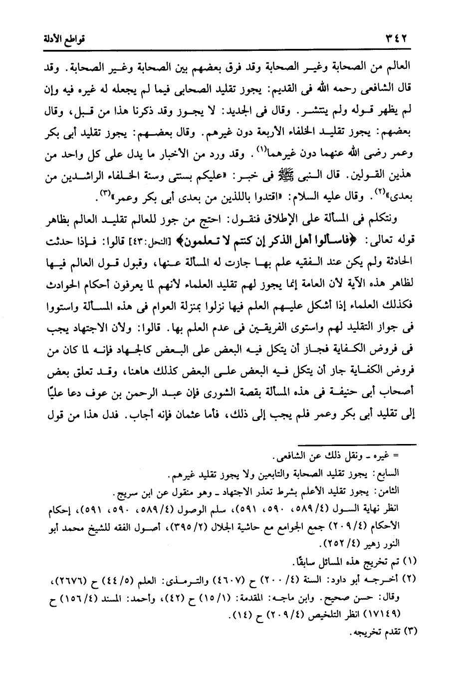 ونتكلم في المسألة على الإطلاق فنقول: احتج من جوز للعالم تقليد العالم بظاهر قوله تعالى: {فَاسْأَلوا أَهْلَ الذِّكْرِ إِنْ كُنْتُمْ لا تَعْلَمُونَ} [النحل: 43] قالوا: فإذا حدثت الحادثة ولم يكن عند الفقيه علم بها جازت له المسألة عنها وقبول قول العالم فيها لظاهر هذه الآية لأن العامة إنما يجوز لهم تقليد العلماء لأنهم لما يعرفون أحكام الحوادث فكذلك العلماء إذا أشكل عليهم العلم فيها نزلوا بمنزلة العوام في هذه المسألة واستووا في جواز التقليد لهم واستوى الفريقين في عدم العلم بها. قالوا: ولأن الاجتهاد يجب في فروض الكفاية فجاز أن يتكل فيه البعض على البعض كالجهاد فإنه لما كان من فروض الكفاية جاز أن يتكل فيه البعض على البعض كذلك هاهنا وقد تعلق بعض أصحاب أبى حنيفة في هذه المسألة بقصة الشورى فإن عبد الرحمن بن عوف دعا عليا إلى تقليد أبى بكر وعمر فلم يجب إلى ذلك فأما عثمان فإنه أجاب. فدل هذا من قول