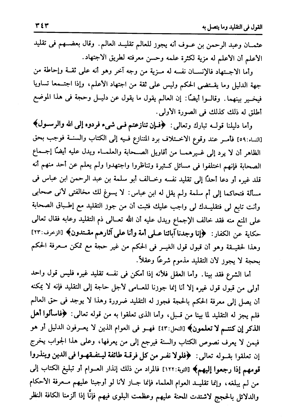 أما الشرع فقد بينا. وأما العقل فلأنه إذا أمكن في نفسه تقليد غيره فليس قول واحد أولى من قبول قول غيره إلا أنا إنما جوزنا للعامى لأجل حاجة إلى التقليد فإنه لا يمكنه أن يصل إلى معرفة الحكم بالحجة فجوز له التقليد ضرورة وهذا لا يوجد في حق العالم فلم يجز له التقليد لما بينا من قبل وأما الذى تعلقوا به من قوله تعالى: {فَاسْأَلوا أَهْلَ الذِّكْرِ إِنْ كُنْتُمْ لا تَعْلَمُونَ} [النحل: 43] فهو في العوام الذين لا يعرفون الدليل أو عو فيمن لا يعرف نصوص الكتاب والسنة فيرجع إلى من يعرفها وعلى هذا الجواب يخرج إن تعلقوا بقوله تعالى: {فَلَوْلا نَفَرَ مِنْ كُلِّ فِرْقَةٍ مِنْهُمْ طَائِفَةٌ لِيَتَفَقَّهُوا فِي الدِّينِ وَلِيُنْذِرُوا قَوْمَهُمْ إِذَا رَجَعُوا إِلَيْهِمْ} [التوبة: 122] فالمراد من ذلك إنذار العوام أو تبليغ الكتاب إلى من لم يبلغه وإنما تقليد العوام العلماء فإنما جاز لأنا لو أوجبنا عليهم معرفة الأحكام والدلائل بالحجج لاشتدت المحنة عليهم وعظمت البلوى فيهم فإنا إذا ألزمنا الكافة النظر