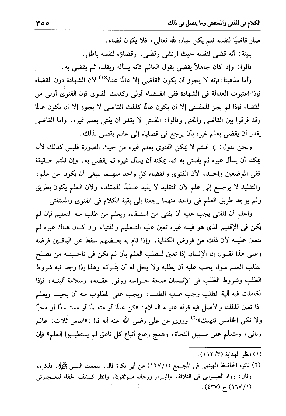 واعلم أن المفتى يجب عليه أن يفتى من استفتاه ويعلم من طلب منه التعليم فإن لم يكن في الإقليم الذى هو فيه غيره تعين عليه التعليم والفتيا وإن كان هناك غيره لم يتعين عليه لأن ذلك من فروض الكفاية وإذا قام به بعضهم سقط عن الباقين فرضه وعلى هذا نقول إن الإنسان إذا تعين لطلب العلم بإنه لم يكن في ناحيته من يصلح لطلب العلم سواه يجب عليه أن يطلبه ولا يحل له أن يتركه وهذا إذا وجد فيه شروط الطلب وشروط الطلب في الإنسان صحة حواسه ووفور عقله وسلامة اليته فإذا تكاملت فيه الية الطلب وجب عليه الطلب ويجب على المطلوب منه أن يجيب ويعلم إذا تعين لذلك والأصل فيه قوله عليه السلام: "كن عالما أو متعلما أو مستمعا أو محبا ولا تكن الخامس فتهلك" 2 وروى عن علي رضى الله عنه أنه قال: الناس ثلاث عالم ربانى ومتعلم على سبيل النجاة وهمج رعاع أتباع كل ناعق لم يستطيبوا العلم فأن