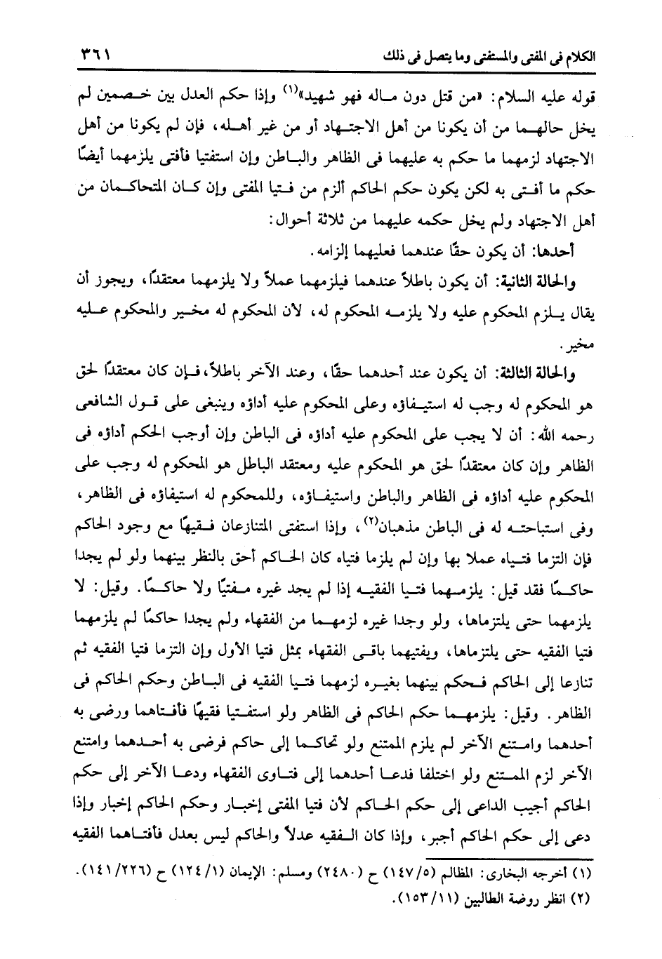 قوله عليه السلام: "من قتل دون ماله فهو شهيد" 1 وإذا حكم العدل بين خصمين لم يخل حالهما من أن يكونا من أهل الاجتهاد أو من غير أهله فإن لم يكونا من أهل الاجتهاد لزمهما ما حكم به عليهما في الظاهر والباطن وإن استفتيا فأفتى يلزمهما أيضا حكم ما أفتى به لكن يكون حكم الحاكم ألزم من فتيا المفتى وإن كان المتحاكمان من أهل الاجتهاد ولم يخل حكمه عليهما من ثلاثة أحوال:
