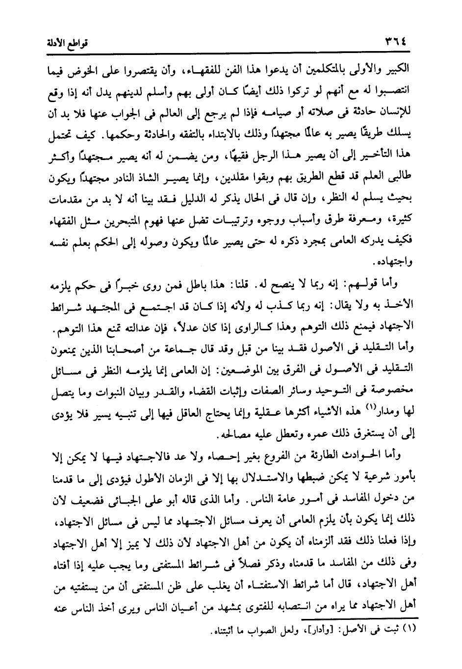 الكبير والأولى بالمتكلمين أن يدعوا هذا الفن للفقهاء وأن يقتصروا على الخوض فيما انتصبوا له مع أنهم لو تركوا ذلك أيضا كان أولى بهم وأسلم لدينهم يدل أنه إذا وقع للأنسان حادثه في صلاته أو صيامه فإذا لم يرجع إلى العالم في الجواب عنها فلا بد أن يسلك طريقا يصير به عالما مجتهدا وذلك بالابتداء بالتفقه والحادثه وحكمها كيف تحتمل هذا التأخير إلى أن يصير هذا الرجل فقيها ومن يضمن له أنه يصير مجتهدا وأكثر طالبى العلم قد قطع الطريق بهم وبقوا مقلدين وإنما يصير الشاذ النادر مجتهدا ويكون بحيث يسلم له النظر وإن قال في الحال يذكر له الدليل فقد بينا أنه لا بد من مقدمات كثيرة ومعرفة طرق وأسباب ووجوه وترتيبات تضل عنها فهوم المتبحرين مثل الفقهاء فكيف يدركه العامى بمجرد ذكره له حتى يصير عالما ويكون وصوله إلى الحكم بعلم نفسه واجتهاده.