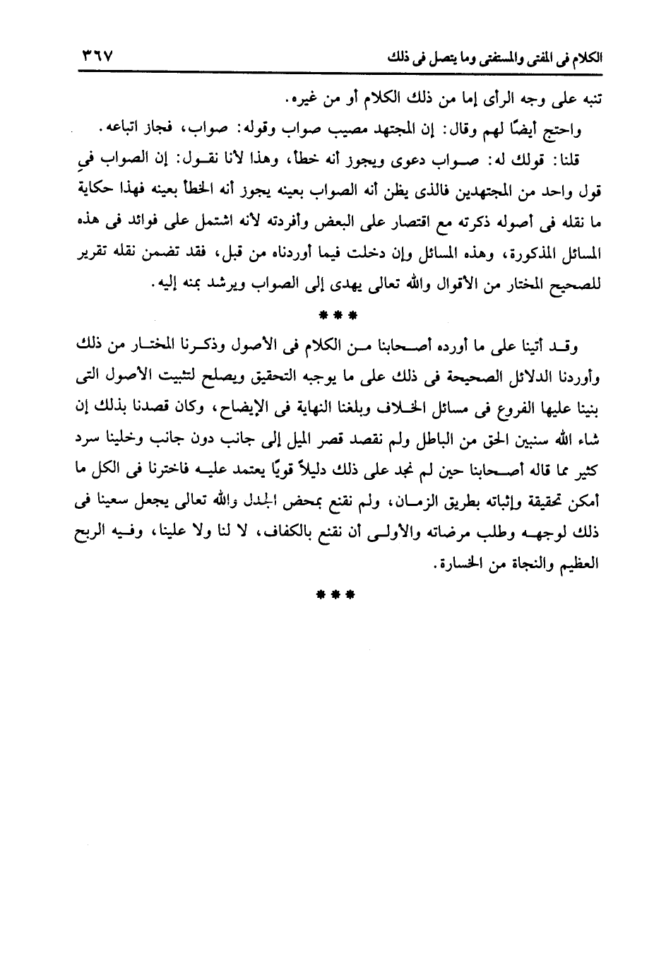 قلنا: قولك له: صواب دعوى ويجوز أنه خطا وهذا لأنا نقول إن الصواب في قول واحد من المجتهدين فالذى يظن أنه الصواب بعينه يجوز أنه الخطأ بعينه فهذا حكاية ما نقله في أصوله ذكرته مع اقتصار على البعض وأفردته لأنه اشتمل على فوائد في هذه المسائل المذكورة وهذه المسائل وإن دخلت فيما أوردناه من قبل فقد تضمن نقله تقرير للصحيح المختار من الأقوال والله تعالى يهدى إلى الصواب ويرشد بمنه إليه.