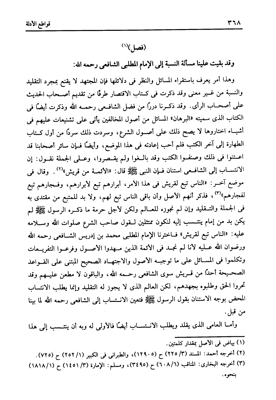 وقد ذكرنا دررا من فضل الشافعى رحمة الله وذكرت أيضا في الكتاب الذى سميته البرهان المسائل من أصول المخالفين يأتى على تشنيعات عليهم في أشياء اختاروها لا يصح ذلك على أصول الشرع وسردت ذلك سردا من أول كتاب الطهارة إلى آخر الكتب فلم أحب إعادته في هذا الموضع وأيضا فإن سائر أصحابنا قد اعتنوا في ذلك وصنفوا الكتب وقد بالغوا ولم يقصروا وعلى الجملة نقول إن الانتساب إلى الشافعى استنان فإن النبى صلى الله عليه وسلم قال: "الأئمة من قريش" 2. وقال في موضع آخر: "الناس تبع لقريش في هذا الأمر أبرارهم تبع لأبرارهم وفجارهم تبع لفجارهم" 3 فذكر أنهم الأصل وأن باقى الناس تبع لهم ولا بد للمتبع من مقتدى به في الجملة والتقليد وإن لم نجوزه للعالم ولكن لأجل حرمة ما ذكره الرسول صلى الله عليه وسلم لم يكن بد من أمام ينتسب إليه لنكون ممتثلين لقول صاحب الشرع صلوات الله وسلامه عليه: "الناس تبع لقريش" فاخترنا الأمام المطلبى محمد بن إدريس الشافعى رحمه الله ورضوان الله عليه لأنا لم نجد في الأئمة الذين مهدوا الأصول وفرعوا التفريعات وتكلموا في المسائل على ما توجبه الأصول والاجتهاد الصحيح المبتنى على القواعد الصحيحة أحدا من قريش سوى الشافعى رحمه الله والباقون لا مطعن عليهم وقد تحروا الحق وطلبوه بجهدهم لكن العالم الذى لا يجوز له التقليد وإنما يطلب الانتساب المحض بوجه الاستنان بقول الرسول صلى الله عليه وسلم فتعين الانتساب إلى الشافعى رحمه الله لما بينا من قبل.