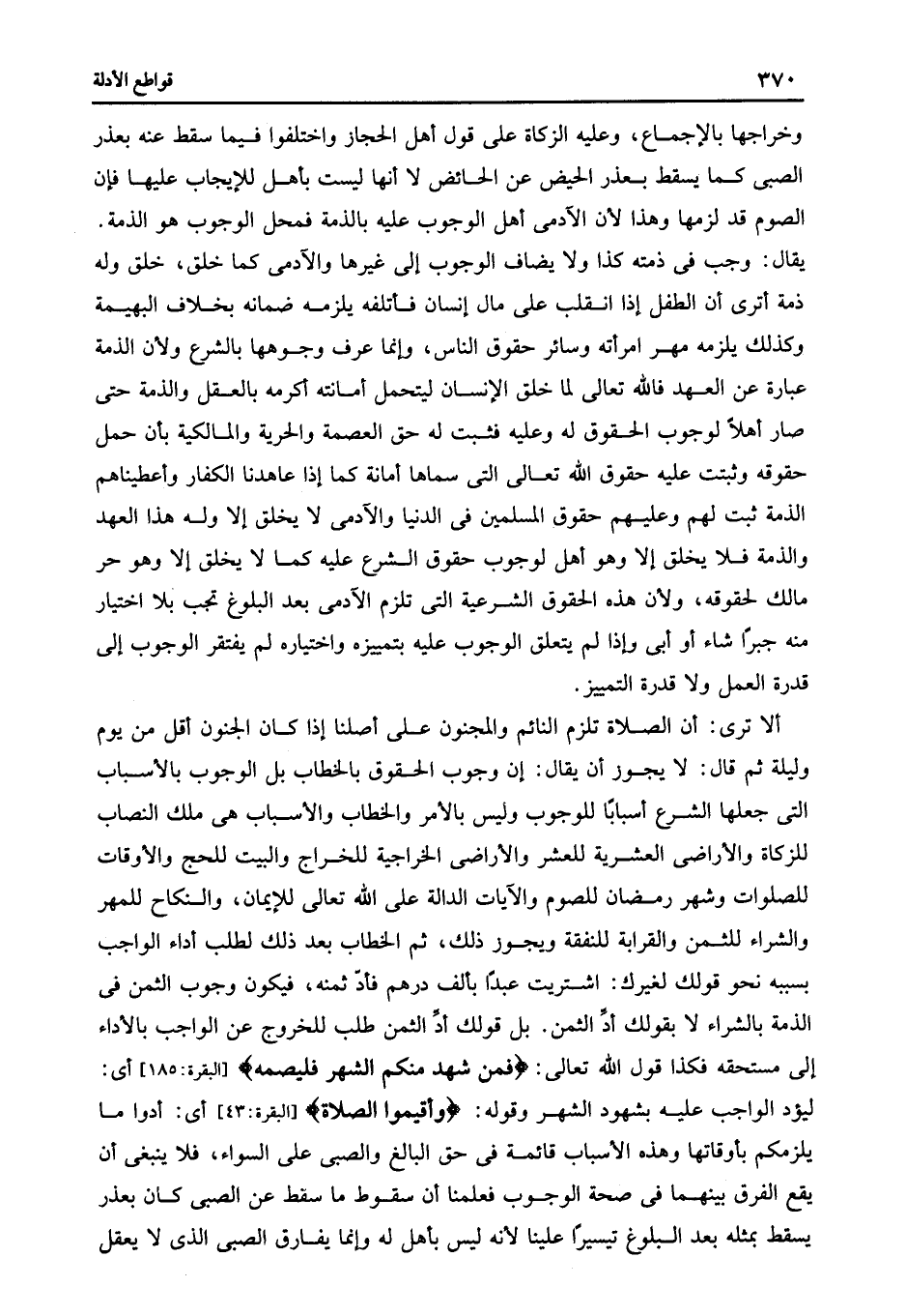 ألا ترى: أن الصلاة تلزم النائم والمجنون على أصلنا إذا كان الجنون أقل من يوم وليلة ثم قال: لا يجوز أن يقال: إن وجوب الحقوق بالخطاب بل الوجوب بالأسباب التي جعلها الشرع أسبابا للوجوب وليس بالأمر والخطاب والأسباب هى ملك النصاب للزكاة والأراضى العشرية للعشر والأراضى الخراجية للخراج والبيت للحج والأوقات للصلوات وشهر رمضان للصوم والآيات الدالة على الله تعالى للإيمان والنكاح للمهر والشراء للثمن والقرابه للنفقة ويجوز ذلك ثم الخطاب بعد ذلك لطلب أداء الواجب بسببه نحو قولك لغيرك اشتريت عبدا بألف درهم فأد ثمنه فيكون وجوب الثمن في الذمة بالشراء لا بقولك أد الثمن. بل قولك أد الثمن طلب للخروج عن الواجب بالأداء إلى مستحقه فكذا قول الله تعالى: {فَمَنْ شَهِدَ مِنْكُمُ الشَّهْرَ فَلْيَصُمْهُ} [البقرة: 185] أي: ليؤد الواجب عليه بشهود الشهر وقوله: {وَأَقِيمُوا الصَّلاةَ} [البقرة: 43] أي: أدوا ما يلزمكم بأوقاتها وهذه الأسباب قائمة في حق البالغ والصبى على السواء فلا ينبغى أن يقع الفرق بينهما في صحة الوجوب فعلمنا أن سقوط ما سقط عن الصبى كان بعذر يسقط بمثله بعد البلوغ تيسيرا علينا لأنه ليس بأهل له وإنما يفارق الصبى الذى لا يعقل