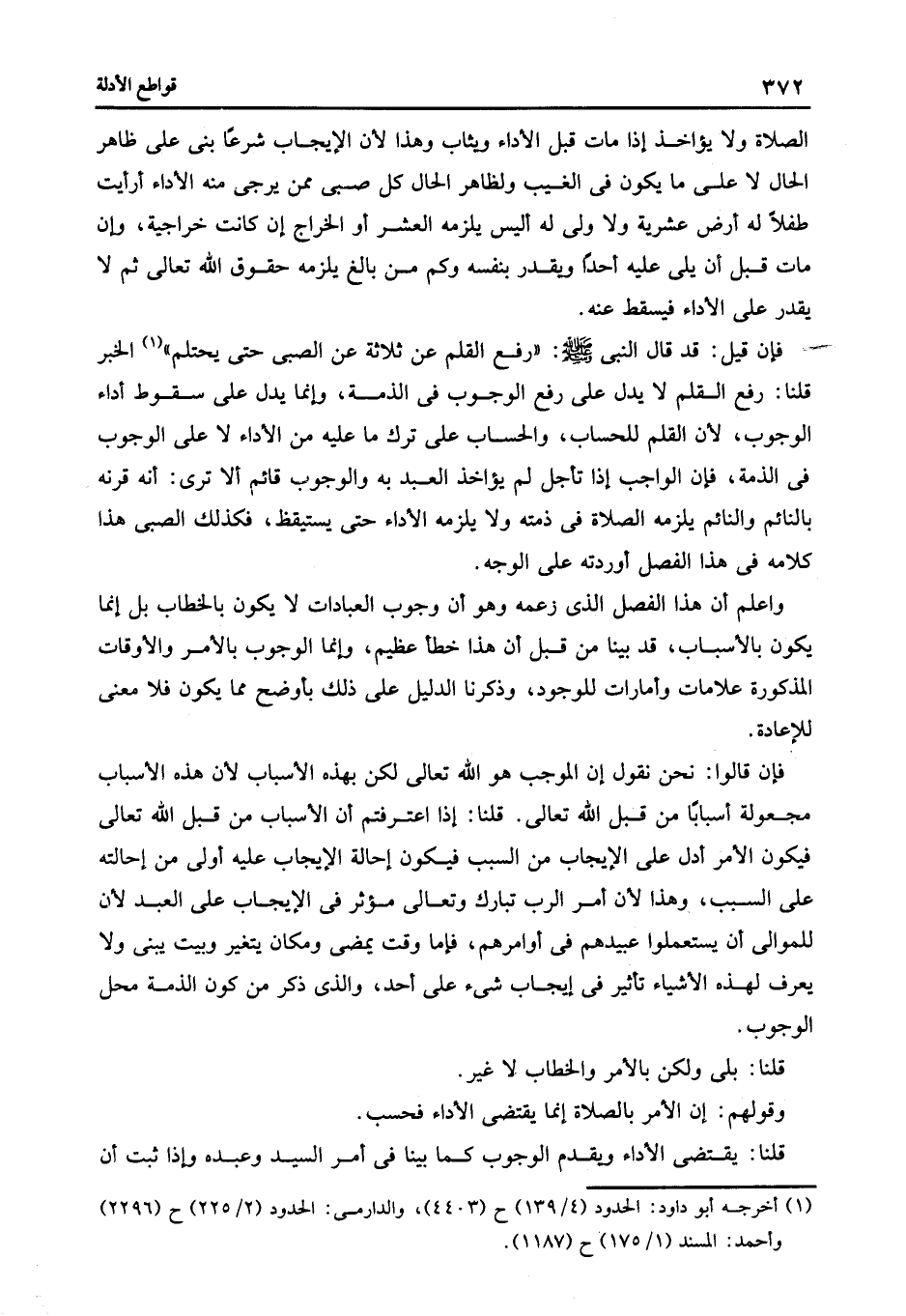 فإن قيل: قد قال النبى صلى الله عليه وسلم: "رفع القلم عن ثلاثة عن الصبى حتى يحتلم" 1 الخبر قلنا: رفع القلم لا يدل على رفع الوجوب في الذمة وإنما يدل على سقوط أداء الوجوب لأن القلم للحاسب والحساب على ترك ما عليه من الأداء لا على الوجوب في ذمة فإن الواجب إذا تأجل لم يؤاخذ العبد به والوجوب قائم ألا ترى: أنه قرنه بالنائم والنائم يلزمه الصلاة في ذمته ولا يلزمه الأداء حتى يستيقظ فكذلك الصبى هذا كلامه في هذا الفصل أوردته على الوجه.
