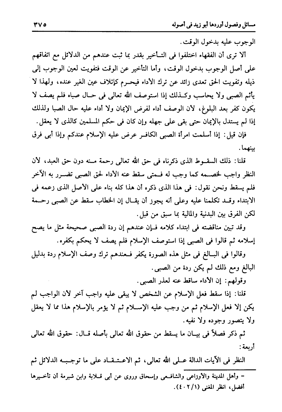 ألا ترى أن الفقهاء اختلفوا في التأخير بقدر بما ثبت عندهم من الدلائل مع اتفاقهم على أصل الوجوب بدخول الوقت وأما التأخير عن الوقت فتفويت لعين الوجوب إلى ذيله وتفويت الحق تعدى زائد عن ترك الأداء فيحرم كإتلاف عين الغير عنده ولهذا لا يأثم الصبى ولا يحاسب وكذلك إذا استوصف الله تعالى في حال صباه فلم يصف لا يكون كفر بعد البلوغ لأن الوصف أداء لفرض الإيمان ولا أداء عليه حال الصبا ولذلك إذا لم يستدل بالإيمان حتى بقى على جهله وإن كان في حكم المسلمين كالذى لا يعقل.