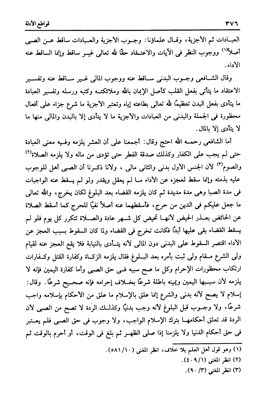 أما الشافعى رحمه الله احتج وقال: أجمعنا على أن العشر يلزمه وفيه معنى العبادة حتى لم يجب على الكفار وكذلك صدقة الفطر حتى تؤدى من ماله ولا يلزمه الصلاة2 والصوم3 لأن الجنس الأول بدنى والثانى مالى ولأنا ذكرنا أن الصبى أهل للوجوب عليه بذمته وإنما سقط لعجزه عن الأداء ما لم يعقل ويقدر ولو لم يسقط عنه الواجبات في مدة الصبا وهى مدة مديدة ثم كان يلزمه القضاء بعد البلوغ لكان يخرج والله تعالى ما جعل عليكم في الدين من حرج فأسقطهما عنه أصلا نفيا للحرج كما أسقط الصلاة عن الحائض بعذر الحيض لأنها تحيض كل شهر عادة والصلاة تتكرر كل يوم فلو لم يسقط القضاء بقى عليها أبدا فكانت تخرج في القضاء ولما كان السقوط بسبب العجز عن الأداء اقتصر السقوط على البدنى دون المالى لأنه يتأدى بالنيابة فلا يقع العجز عنه لقيام ولى الشرع مقام ولى ثبت بأمره بعد البلوغ فقال يلزمه الزكاة وكفارة القتل وكفارات ارتكاب محظورات الإحرام وكل ما صح سببه في حق الصبى وأما كفارة اليمين فإنه لا يلزمه لأن سببها اليمين ويمينه باطلة شرعا بخلاف إحرامه فإنه صحيح شرعا. وقال: إسلام لا يصح لأنه بدني والشرع إنما علق بالإسلام ما علق من الأحكام بإسلامه واجب شرعا ولا وجوب قبل البلوغ لأنه وجب بدنيا وكذلك الردة لا تصح من الصبى لأن الردة قد تعلق أحكامها بترك الإسلام الواجب ولا وجوب في حق الصبى فلم يعتبر في حق أحكام الدنيا ولا يلزمنا إذا صلى الظهر ثم بلغ في الوقت أو أحرم بالوقت ثم