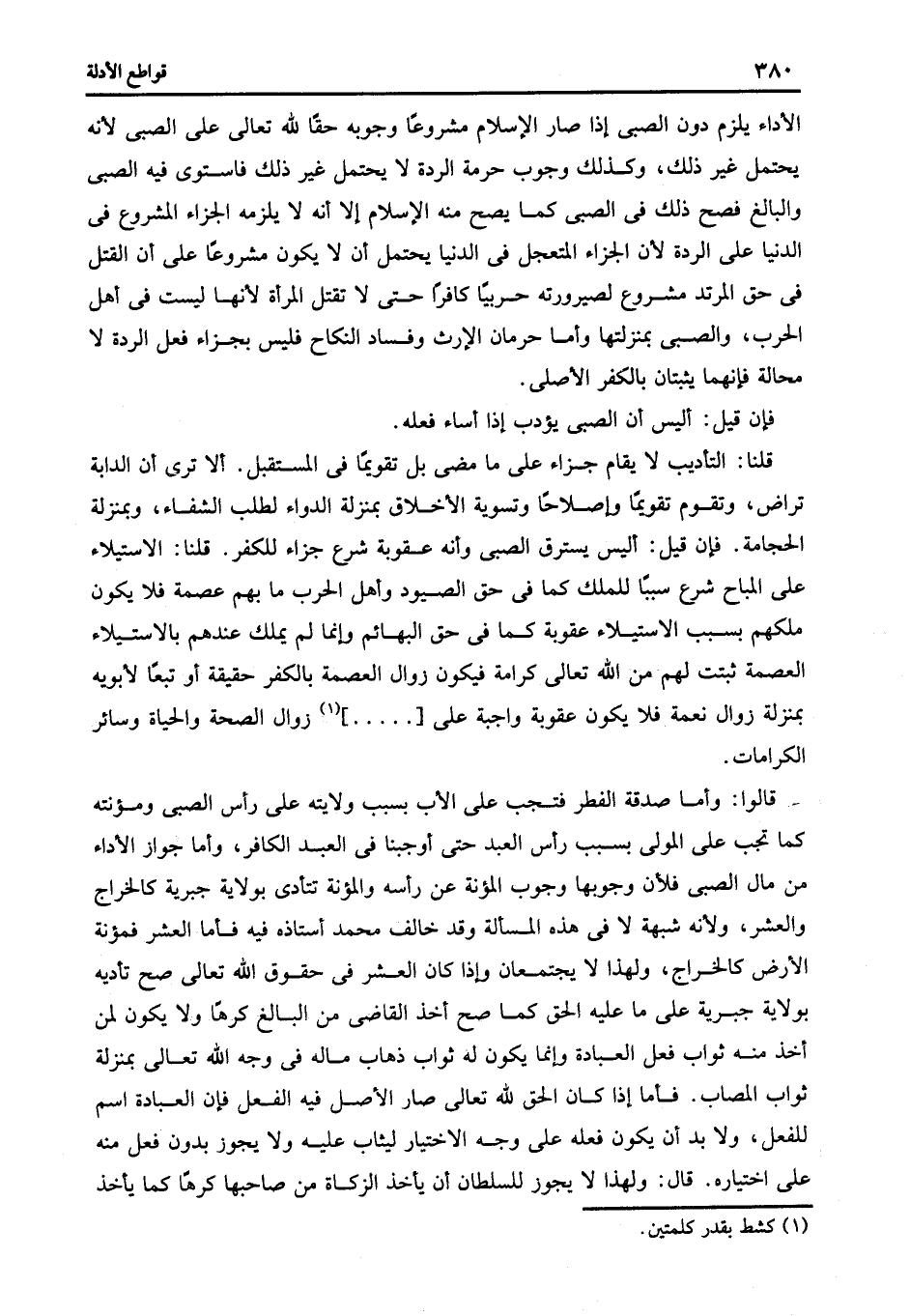 قالوا: وأما صدقة الفطر فتجب على الأب بسبب ولايته على رأس الصبى ومؤنته كما تجب على المولى بسبب رأس العبد حتى أوجبنا في العبد الكافر وأما جواز الأداء من مال الصبى فلأن وجوبها وجوب المؤنة عن رأسه والمؤنة تتأدى بولية جبرية كالخراج والعشر ولأنه شبهة لا في هذه المسألة وقد خالف محمد أستاذه فيه فأما العشر فمؤنة الأرض كالخراج ولهذا لا يجتمعان وإذا كان العشر في حقوق الله تعالى صح تأدية بولاية جبرية على ما عليه الحق صح أخذ القاضى من البالغ كرها ولا يكون لمن أخذ منه ثواب فعل العبادة وإنما يكون له ثواب ذهاب ماله في وجه الله تعالى بمنزلة ثواب المصاب. فأما إذا كان الحق لله تعالى صار الأصل فيه الفعل فإن العبادة فيه اسم للفعل ولا بد أن يكون فعله على وجه الاختيار ليثاب عليه ولا يجوز بدون فعل منه على اختياره. قال: ولهذا لا يجوز للسلطان أن يأخذ الزكاة من صاحبها كرها كما يأخذ