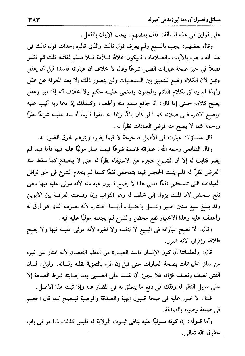 وقال بعضهم: يجب بالسمع ولم يعرف قول ثالث والذى قالوه إحداث قول ثالث في هذا أنه وجب بالآيات والعلامات فيكون خلافا للأمة فلا يسلم لقائله ذلك ثم ذكر فصلا في حيز صحة عبارات الصبى شرعا وقال لا خلاف أن عباراته فاسدة قبل أن يعقل ويميز لأن الكلام وضع للتمييز بين السمعيات ولن يتصور ذلك إلا بعد المعرفة عن عقل ولهذا لم يتعلق بكلام النائم والمجنون والمغمى عليه حكم ولا خلاف أنه إذا ميز وعقل يصح كلامه حتى إذا قال: أنا جائع سمع منه وأطعم وكذلك إذا دعا ربه أثيب عليه ويصح أذكاره في صلاته كما لو كان بالغا وإنما اختلفوا فيما أفسد عليه شرعا نظرا ورحمة كما لا يصح منه فرض العبادات نظرا له.